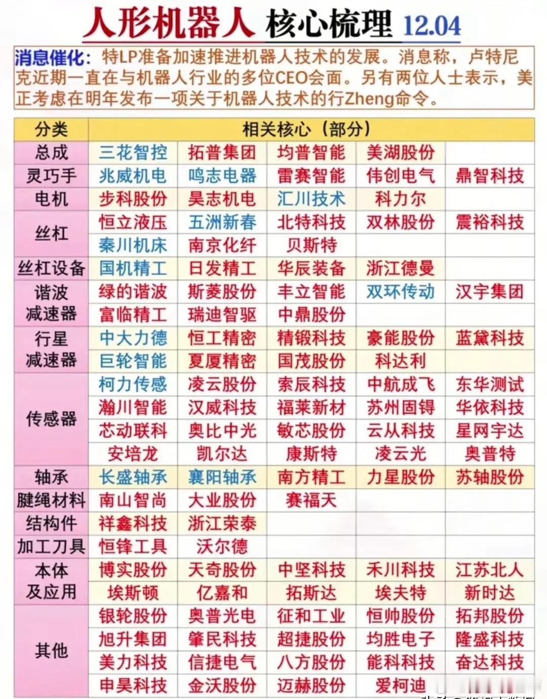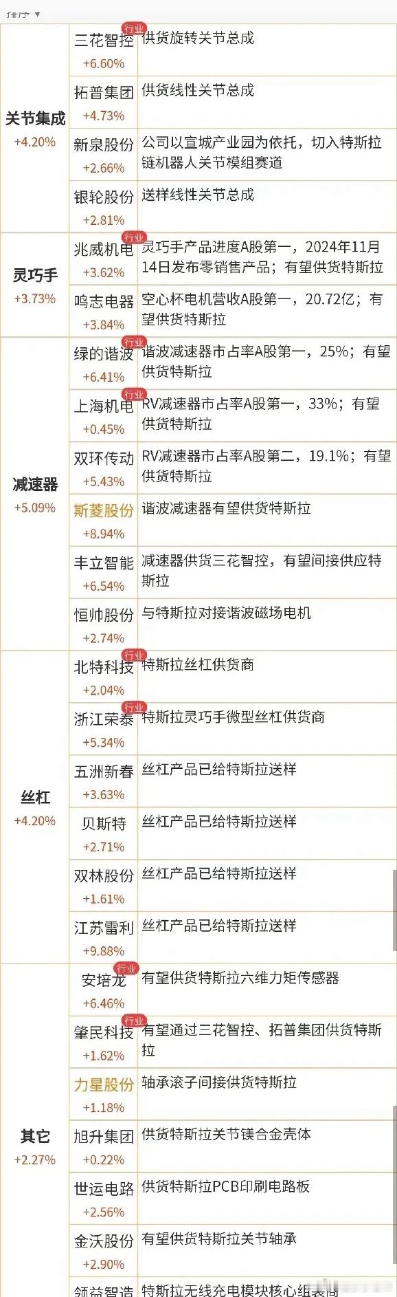 特斯拉机器人技术新突破,国内哪些公司与特斯拉机器人概念高度关联?12月3日特斯拉发布实验室跑步视频,擎天柱以约3.8米/秒速度稳定慢跑,该视频引爆全网,马斯克称V3版将于2026年初发布,逼真度还有大幅提升。特斯拉机器人的“供应链拼图”全面梳理从关节、灵巧手到减速器,A股公司分食千亿蛋糕。与特斯拉机器人高度关联的公司有拓普集团、三花智控、浙江荣泰、北特科技等等。北特科技:特斯拉丝杠的Tier2供应商三花智控:机器人关节模块核心供应商浙江荣泰:特斯拉机器人“灵巧手”的核心供应商之一,合作关系明确……理财有风险投资需谨慎资料取材网络仅供参考不能作为投资依据。a股