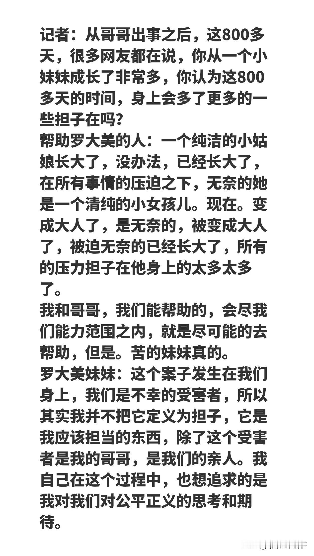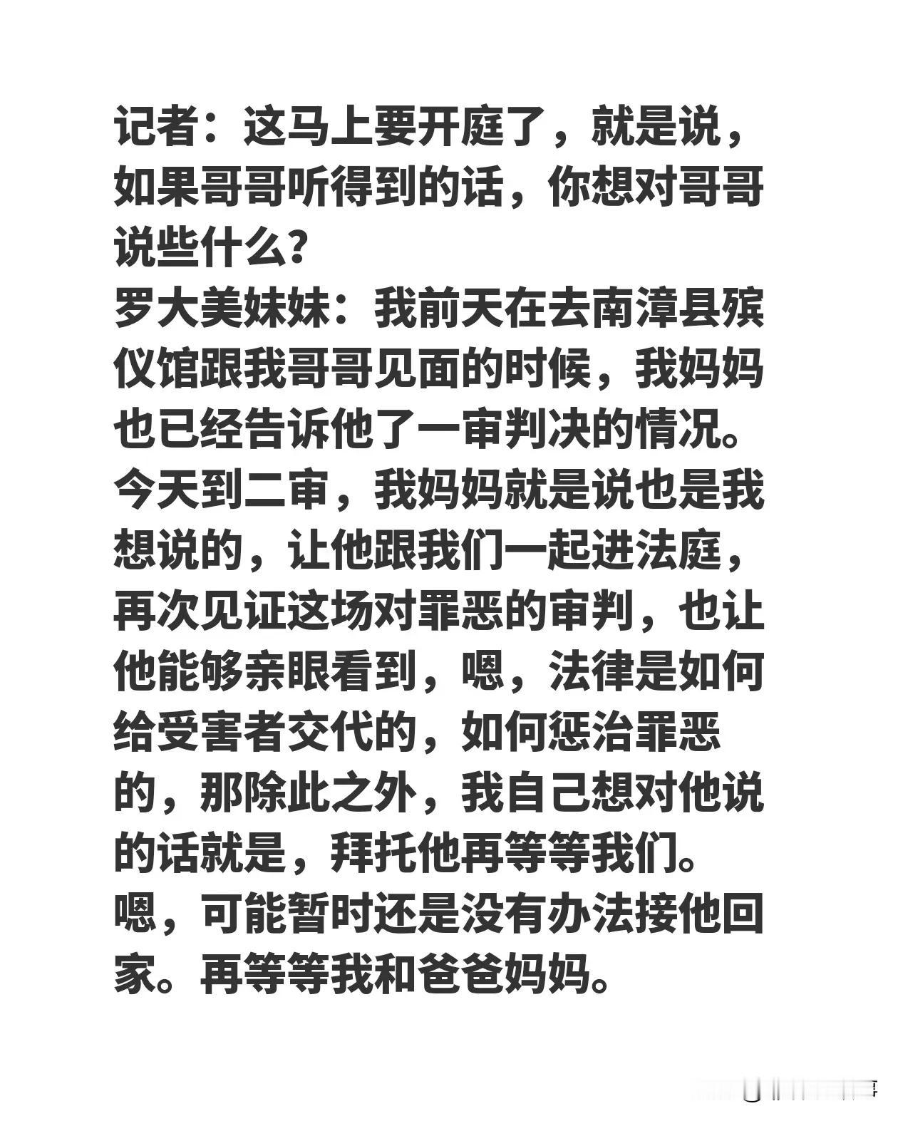 2025年12🈷5日,今天是罗大美被害案二审判决的日子。 800多个日夜,罗大美的妹妹被迫长大,希望二审能让罗大美的家人,有一个满意的答案,让罗大美入土为安。 谁说读书无用?看到现场记者提问,妹妹的的表达能力真的很强,思路也很清晰。 善良不是罗大美的错,只是我们低估了人性的恶。