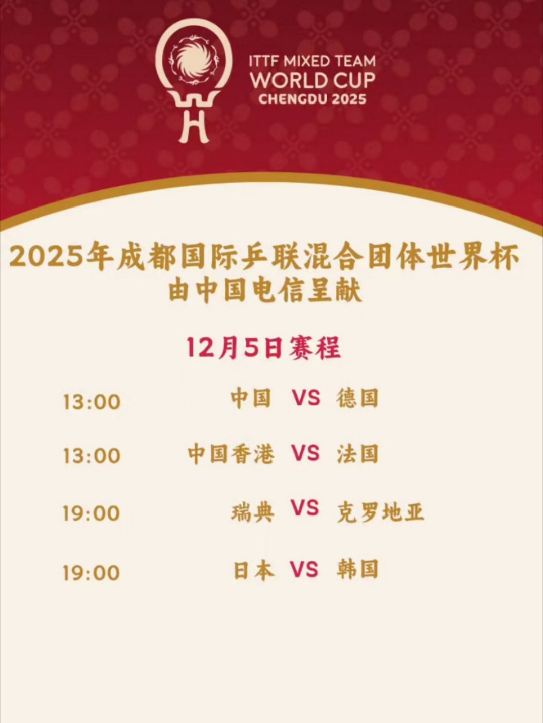 混团世界杯12月5日赛程目前阶段是8强巡回赛。今日看点 中国vs德国,日本vs韩国!比赛分为小组循环赛、八强循环赛和淘汰赛三个阶段,采用15局8胜制,每场按混双、女单、男单、男双/女双顺序进行,每场单项比赛实行三局制,率先拿到8分的队伍获胜。后两盘双打比赛的顺序将在赛前由排名较低队伍的队长决定,为比赛增添策略和悬念。今年4月,国际奥委会决定在2028年洛杉矶奥运会新增乒乓球混合团体项目,因此本届赛事也是乒乓球混合团体项目被纳入洛杉矶奥运会后的首次世界杯比赛。