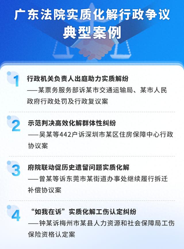 本次发布的案例共四个,在某票务服务部诉某市交通运输局、某市人民政府行政处罚及行政复议案中,行政机关负责人积极参与协调促成争议化解。在吴某等442户诉深圳市某区住房保障中心行政协议案中,通过示范判决高效化解已经成诉的群体性纠纷。在曾某等诉东莞市某街道办事处继续履行拆迁补偿协议案中,加强府院联动实质化解历史遗留问题。在钟某诉梅州市某县人力资源和社会保障局工伤保险资格认定案中,推动跨省行政机关主动担当作为。