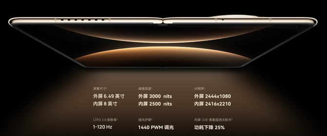 屏幕表现上,MateX7配备6.49英寸OLED外屏与8英寸OLED内屏的双屏组合,外屏分辨率达2444×1080,峰值亮度3000nits;内屏分辨率2416×2210,峰值亮度2500nits,双屏均支持1-120HzLTPO自适应刷新率与1440Hz高频PWM调光技术,既能保证流畅操作体验,又能有效降低眼部疲劳,412ppi的屏幕像素密度则带来清晰细腻的视觉效果。