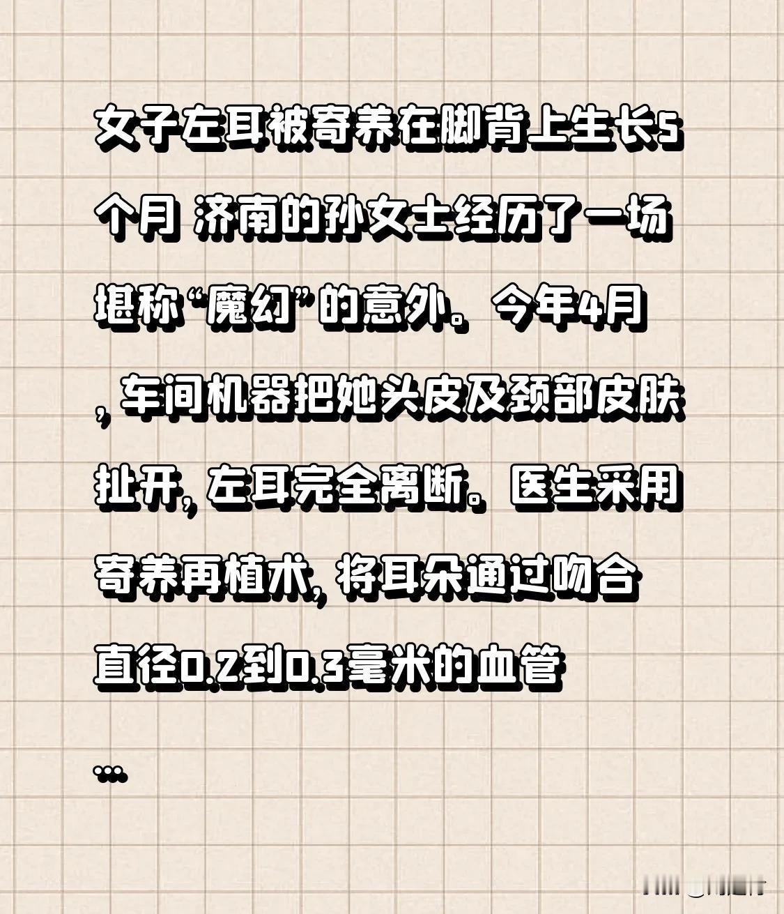 女子左耳被寄养在脚背上生长5个月 女子左耳寄养脚背5个月 济南孙女士 遭遇“魔幻”意外 今年4月 车间机器扯裂其头皮与颈部皮肤 左耳完全离断 医生行寄养再植术 将耳朵经吻合0.2到0.3毫米血管 “寄养”于脚背 此后5个月 孙女士带着脚背耳朵生活 每天醒来先看耳朵 穿宽松鞋 放慢脚步走路 所幸 耳朵最终复位 拆线时 孙女士望着镜中渐愈容颜 激动落泪 医学之神奇 令人惊叹 它赋予孙女士重迎生活的勇气 让我们见证生命顽强 领略医学伟大 再植手指 断指再植技术 人工耳植入 左耳穿刺 左耳耳洞