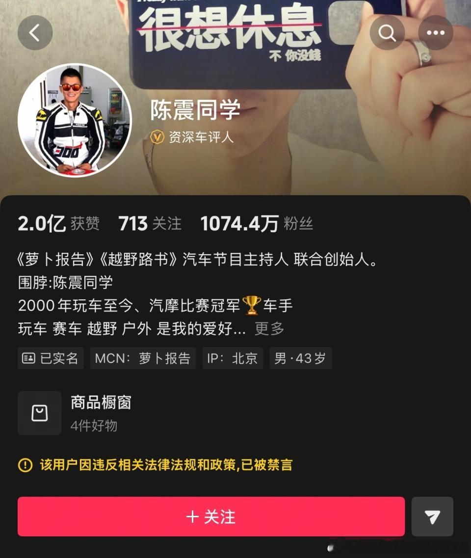 陈震账号被全网禁言我这波站陈震。利益完全不相关的路人。时不时刷到陈震的微博,他的风格一向如此,并不针对某些品牌。反倒是某些品牌极端粉各种的诅咒让人觉得脑回路不可思议这其中最大的可能就是...✓ 吃到了流量红利,有了足够的影响力之时就不能像个普通人一样,随心所欲的对骂回去,得考虑的更周全了。✓ 法务足够专业,且企业能有的不对称信息还是太多了。 ✓ 香港捐款的事儿?按照这标准,好多账号都可以永封了。比如艹老师,比如超会煽动情绪的***(欢迎补充) 在配合上今天今天“出狱”...这么一对比,那简直一整个大无语。