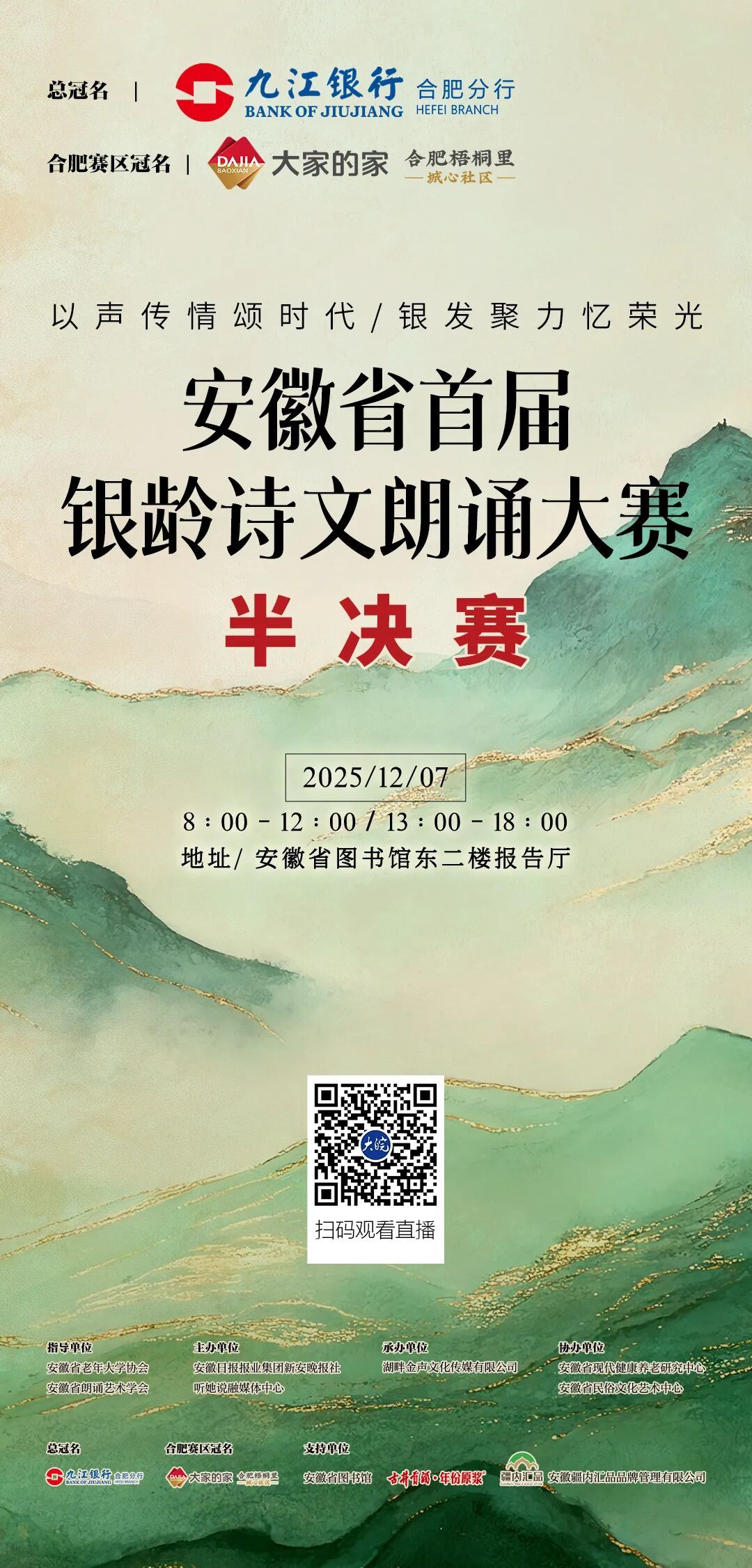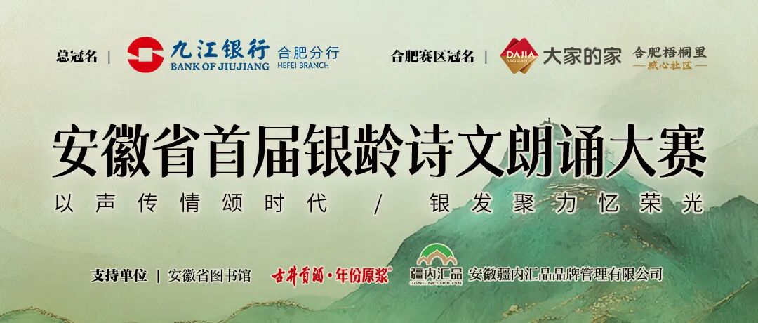 安徽省首届银龄诗文朗诵大赛由安徽省老年大学协会、安徽省朗诵艺术学会指导,安徽日报报业集团新安晚报社·大皖新闻、听她说融媒体中心联合主办,安徽省现代健康养老研究中心和安徽省民俗文化艺术中心协办,九江银行合肥分行总冠名,大家的家·合肥梧桐里城心养老社区为合肥赛区冠名。同时,安徽省图书馆、古井贡酒·年份原浆、安徽疆内汇品品牌管理有限公司也对本次大赛给予大力支持。