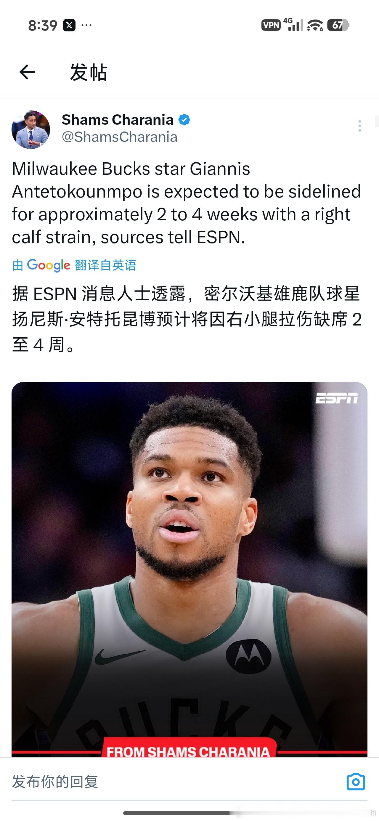 Shame报道:雄鹿队球星字母哥预计将因右小腿拉伤缺席2至4周。字母哥