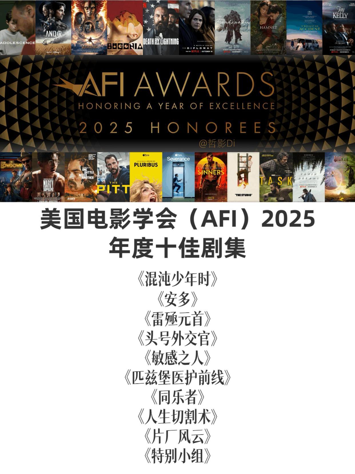 美国电影学会2025年度十佳影视美国电影学会公布2025年度十佳影片/剧集2025年度十佳影片《阿凡达:火与烬》《拯救地球》《弗兰肯斯坦》《哈姆奈特》《影星杰·凯利》《至尊马蒂》《一战再战》《罪人》《火车梦》《魔法坏女巫2》2025年度十佳剧集《混沌少年时》《安多》《雷殛元首》《头号外交官》《敏感之人》《匹兹堡医护前线》《同乐者》《人生切割术》《片厂风云》《特别小组》特别奖:《普通事故》