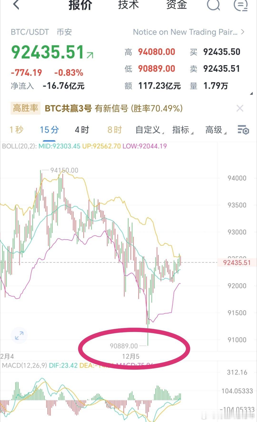 区块链 大饼凌晨三点左右走出下探。最低回撤90900关口,距离目标到达就差400点。回落空间2千余㸃。目标可以说完美抵达。当前价格走势继续在中上轨运行,附图指标有死叉向下拐頭信号。那么日内还是保持反弹空,参考区域可以围绕93000-93350区域分批空,继续看跌91000关口