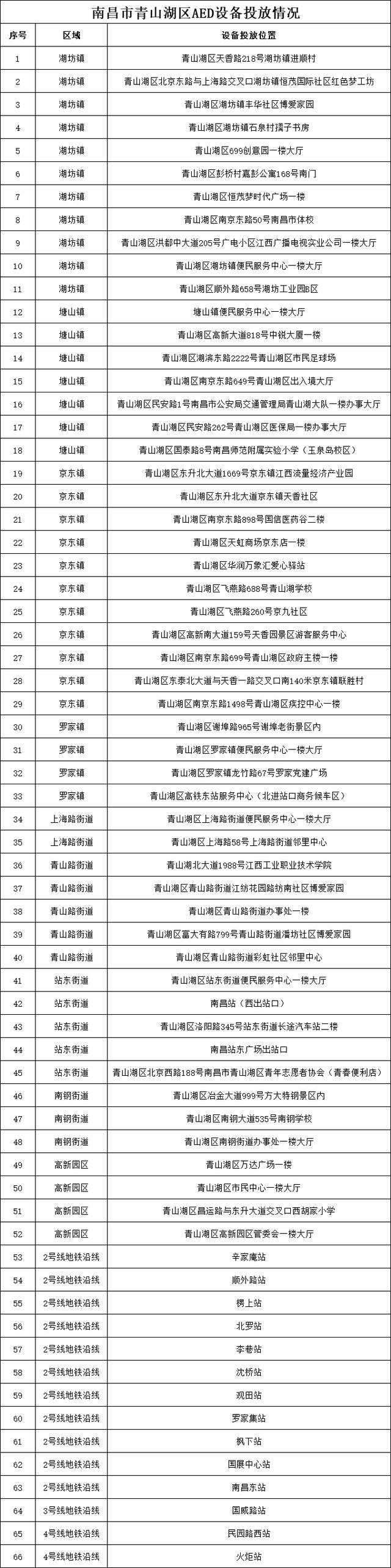 大江新闻讯江西日报全媒体记者黄锦军报道:12月4日从南昌市红十字会传来消息:2022年至2025年,南昌市青山湖区红十字会通过争取财政资金、广泛动员社会爱心力量等方式,共计投放66台自动体外除颤器(AED)。为让人民群众在需要或实施紧急救护时能够就近、快速、便捷地找到AED,更好地保障人民群众生命安全,青山湖区公布AED设备投放点位。