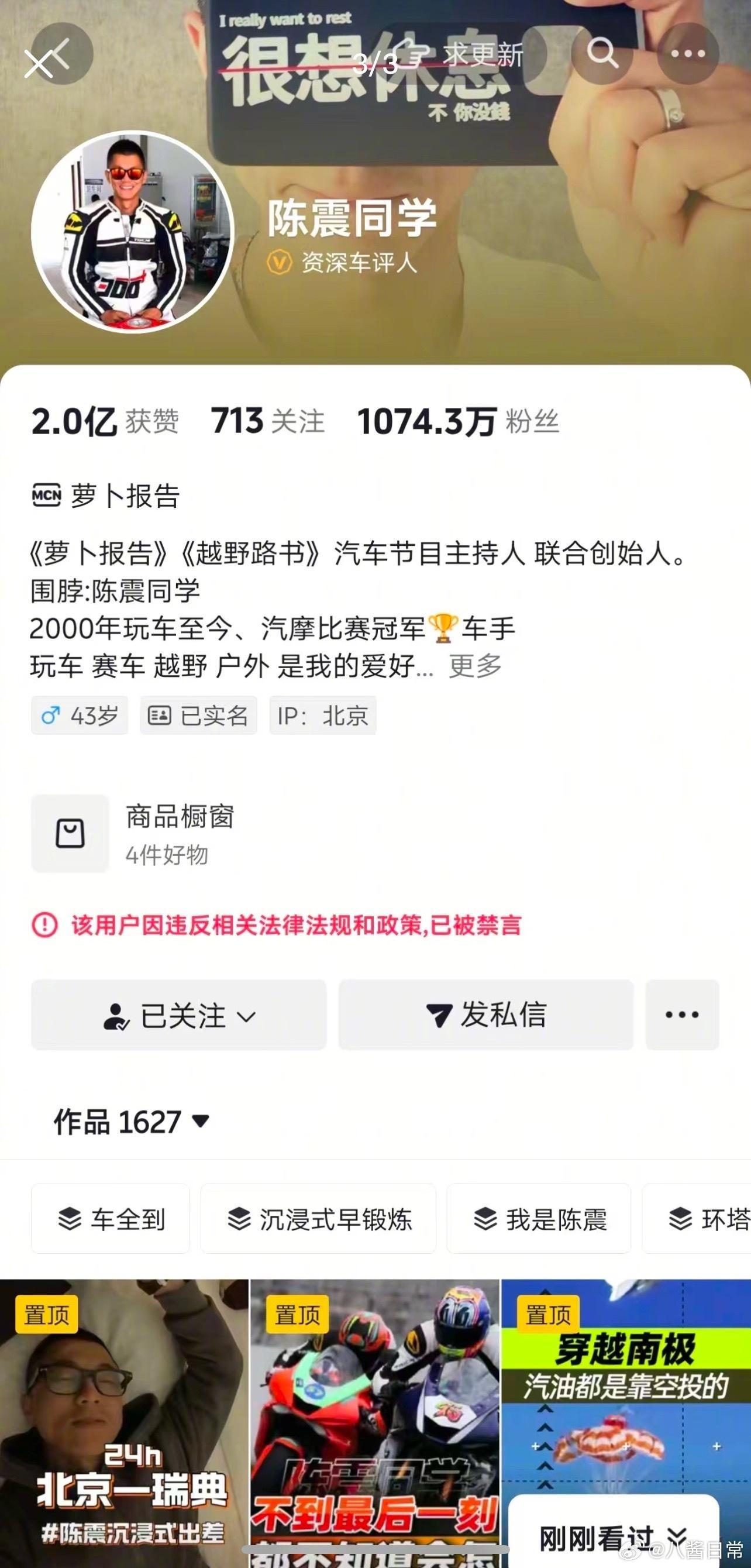 陈震全平台被禁言陈震多平台被禁言 l陈震全网粉丝超2400万