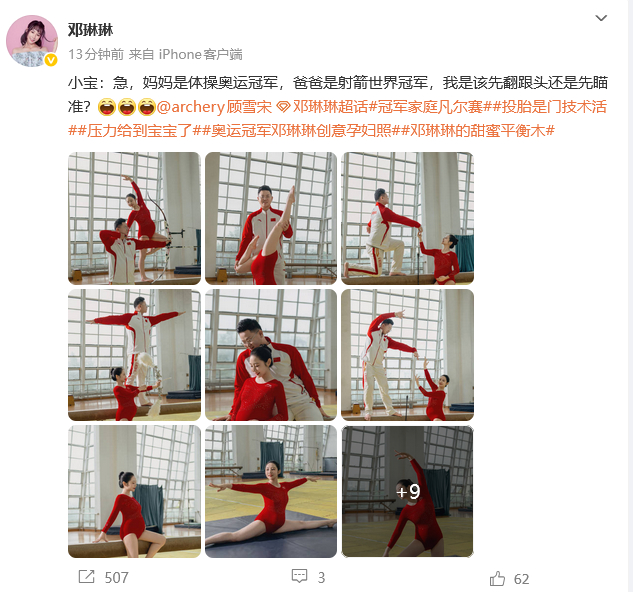 【#奥运冠军邓琳琳晒创意孕妇照#:小宝该先翻跟头还是先瞄准?】#邓琳琳晒孕妇照众网友送祝福# 12月5日上午,北京奥运体操女团冠军、伦敦奥运平衡木冠军晒出18宫格孕妇照,并配文“小宝:急,妈妈是体操奥运冠军,爸爸是射箭世界冠军,我是该先翻跟头还是先瞄准?”今年9月14日,邓琳琳发视频宣布自己怀孕。曾经那个在体操赛场上灵动跳跃的小女生,即将晋升为母亲,众多网友也送上了祝福。邓琳琳,原名邓琳凤,1992年生于安徽亳州市利辛县,北京大学毕业。2000年,邓琳琳进入安徽省体校(安徽体育运动职业技术学院)。2001年加入安徽省体操队。2003年12月邓琳琳入选国家队,2008年开始参加国际大赛;2008年8月获得北京奥运会女子体操团体冠军;2009年10月世界体操锦标赛女子平衡木冠军;2012年7月15日成为中国女子体操队队长,8月获得伦敦奥运会体操女子平衡木冠军。2013年正式退役。2020年,她认识了射箭运动员顾雪宋。2023年10月,邓琳琳与顾雪宋在宁波余姚举行婚礼。婚后,邓琳琳签约入职安徽师范大学,成为安徽师范大学体育学院教师,在教育领域继续发挥自己的价值。(大皖新闻综合)