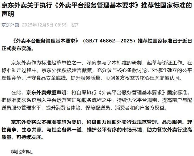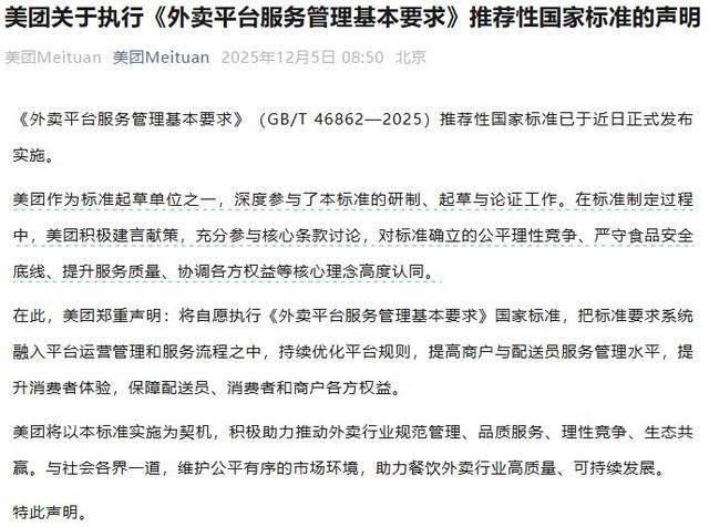 近日,美团、京东外卖、淘宝闪购分别发布关于执行《外卖平台服务管理基本要求》推荐性国家标准的声明: