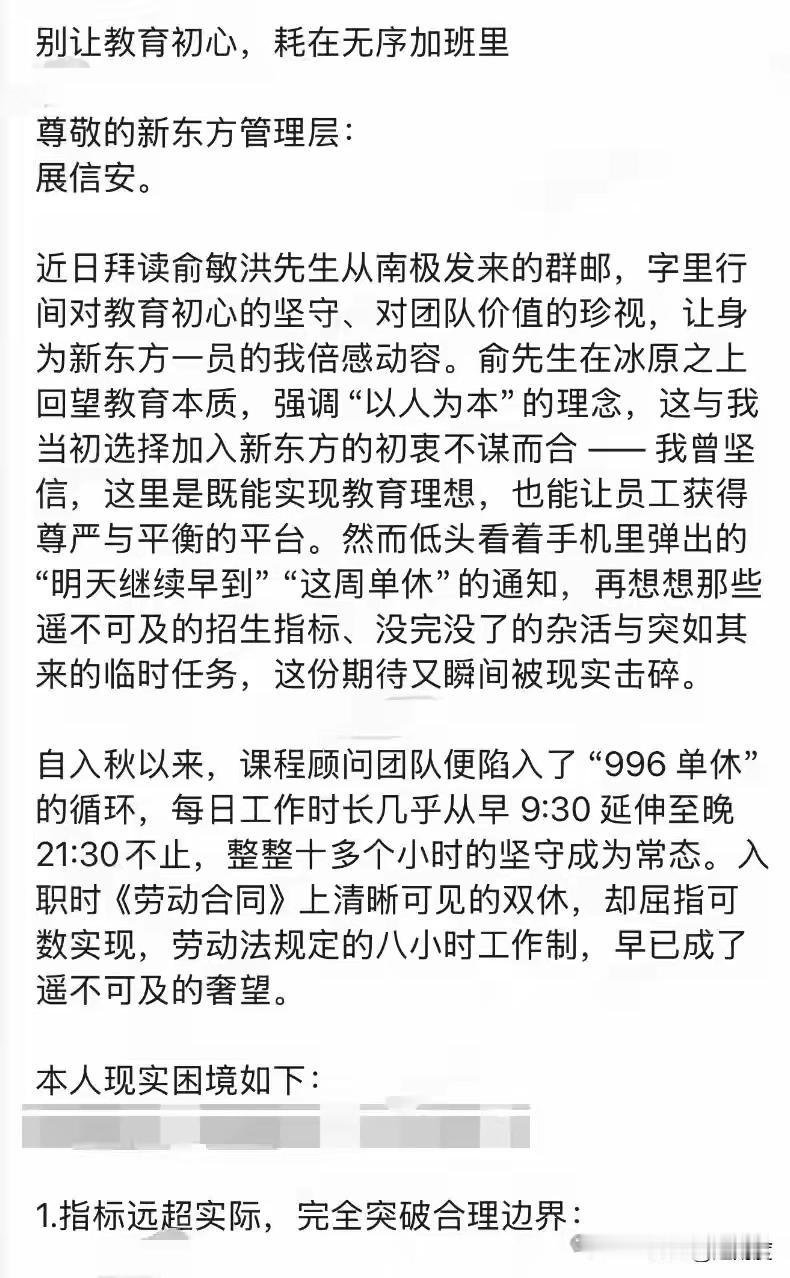 新东方员工吐槽加班成奴账号被秒封。俞老板前几天在南极还说,鼓励员工公开吐槽言论自由,跟员工之间没有隔阂,对普通员工没有发过脾气,通过这件事看,确实用不到他亲自发脾气。制度是8小时工作制,但是给你的工作量是12小时,比如遥不可及的指标、突如其来的临时任务、杂活挤压主页、计划朝令夕改等,大多数企业的普遍现象。再说把教育事业做成商业化,企业的愿景是什么?就是赚钱嘛。内部举报机制能有用,还会发全员信?