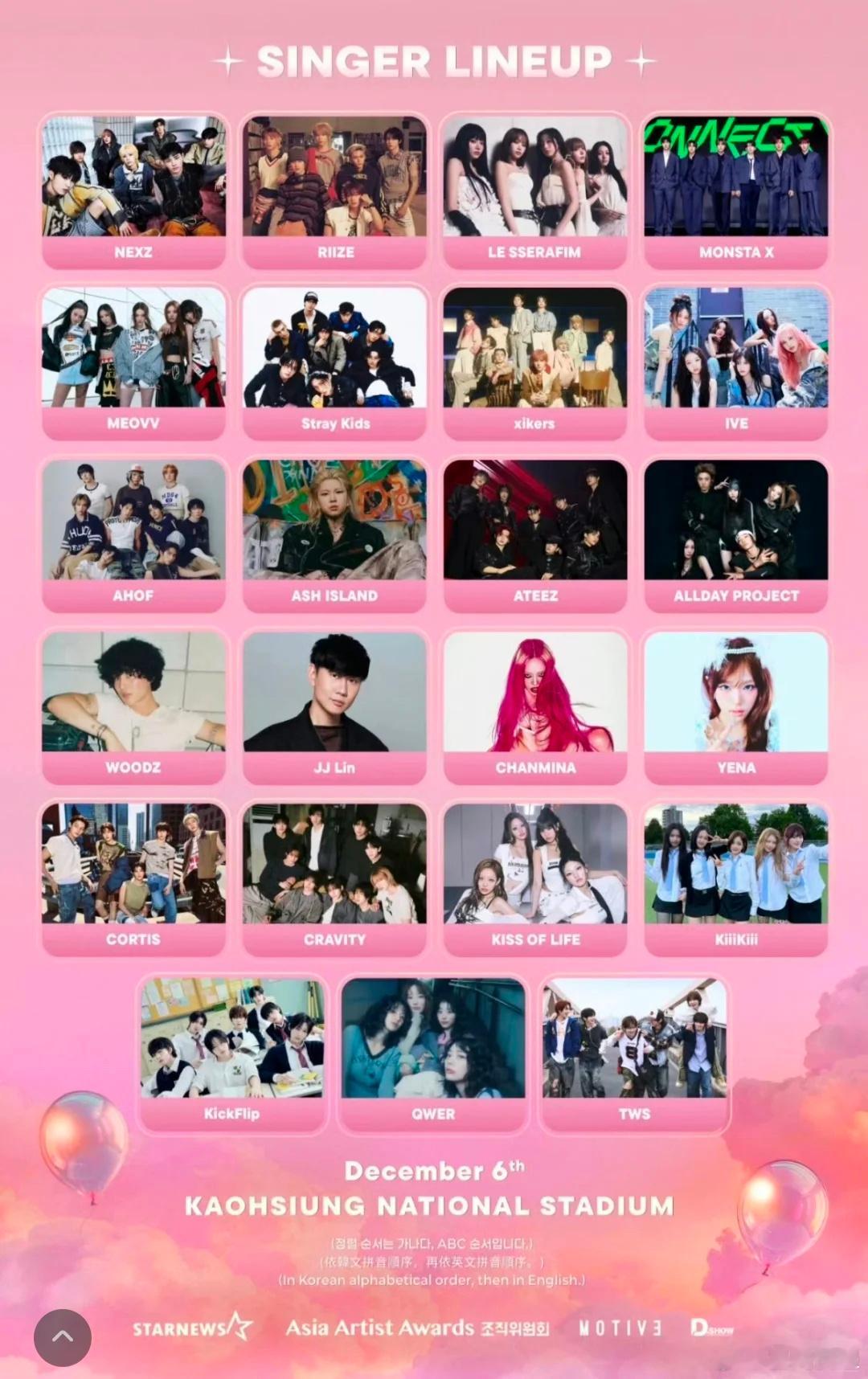 AAA颁奖典礼12.6号台湾主持人:张元英,李俊豪歌手阵容:IU,林俊杰, RIIZE, LE SSERAFIM Stray Kids, ATEEZ, IVE, Monsta X, ALLDAY PROJECT, CORTIS, TWS, WOODZ, KiiKi, MEOVV, CRAVITY, NEXZ, xikers, AHOF, ASH ISLAND & CHAMINA, KISS OF LIFE, YENA, KickFlip, QWER演员阵容:朴宝剑、IU、金裕贞、李伊庚、李浚荣、林允儿、李惠利、车珠英、姜有皙、文素利、朴允浩、佐藤健、严志媛、李俊赫、崔代勋、秋泳愚aaaAAA