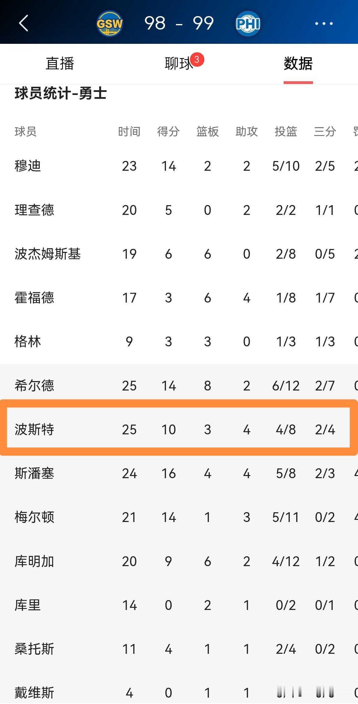 勇士年轻中锋波斯特真是虽败犹荣!尽管今天勇士在客场以98:99惜败于76人,但是波斯特的表现却是可圈可点。 整场比赛下来,波斯特替补出战25分钟,投篮8中4,其中三分球4中2得到10分3篮板4助攻0失误,他的场上正负值为+4。