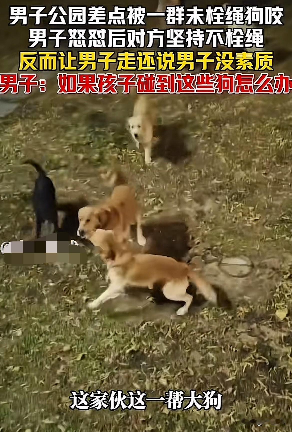 太没素质了!山东,男子在公园发现一群未拴绳的狗,差点就被咬,男子上前找狗主人理论,然而狗主人却一脸不高兴,说男子没素质,让男子赶紧走,男子一气之下,曝光了视频! 这么多的狗出现在公园,简直是太可怕了,碰到老人孩子估计要吓一跳,然而狗主人却毫不在意。 我就纳闷了,对于养狗人,遛狗拴绳就这么难吗?公园是公共场所,不是你家院子。你喜欢狗,别人不一定喜欢,作为狗主人,给狗刷绳是最起码得安全措施,这么大的狗,如果真的咬到人,那就太可怕了。 公共场所,一定要注意,文明养狗不要给别人制造麻烦,尽量减少人与人之间的矛盾,人不能活的太自私,换位思考一下,别总想着自己! 关于狗主人遛狗不拴绳的行为,大家如何看呢? (信息来源:中安在线)