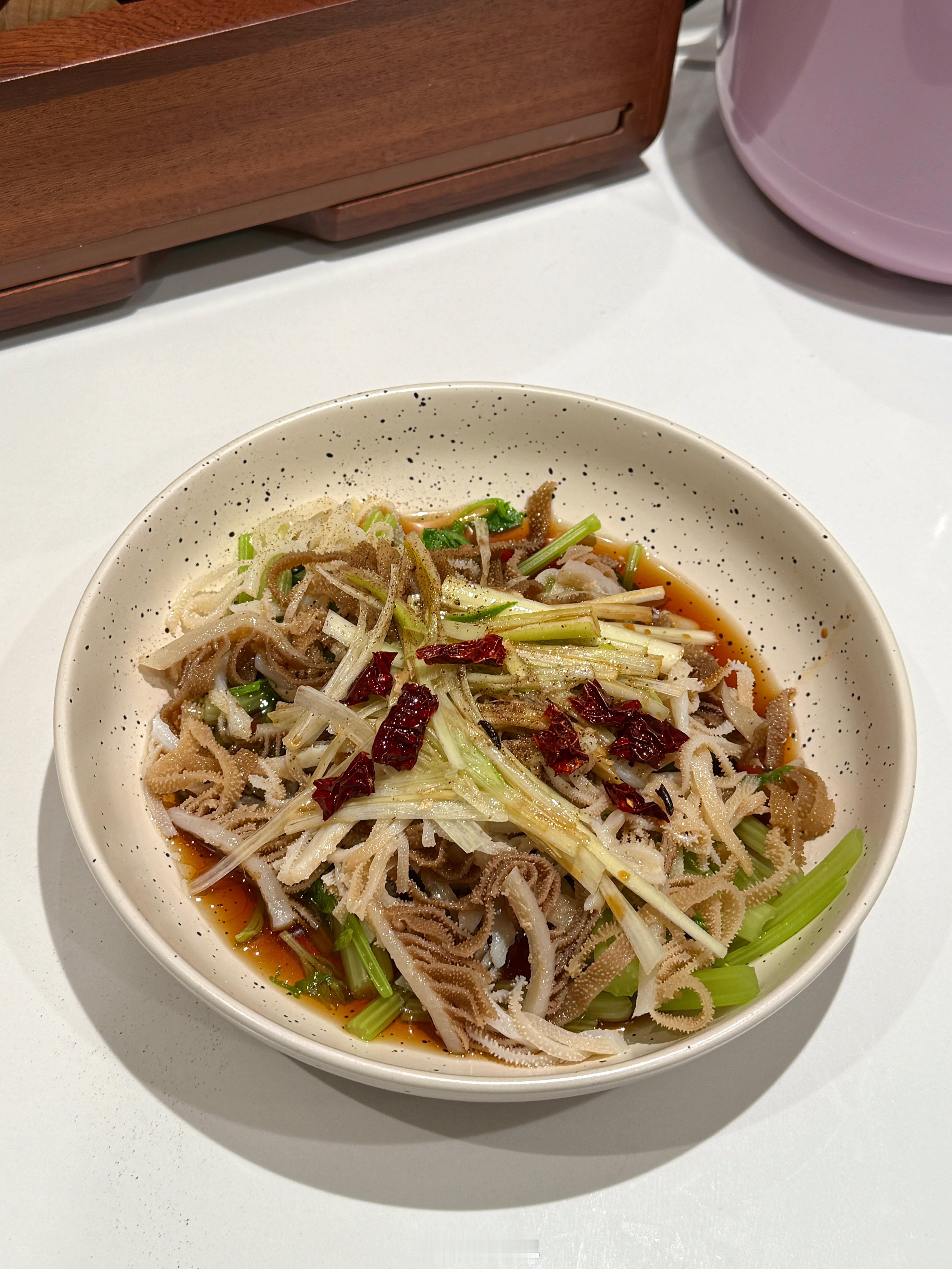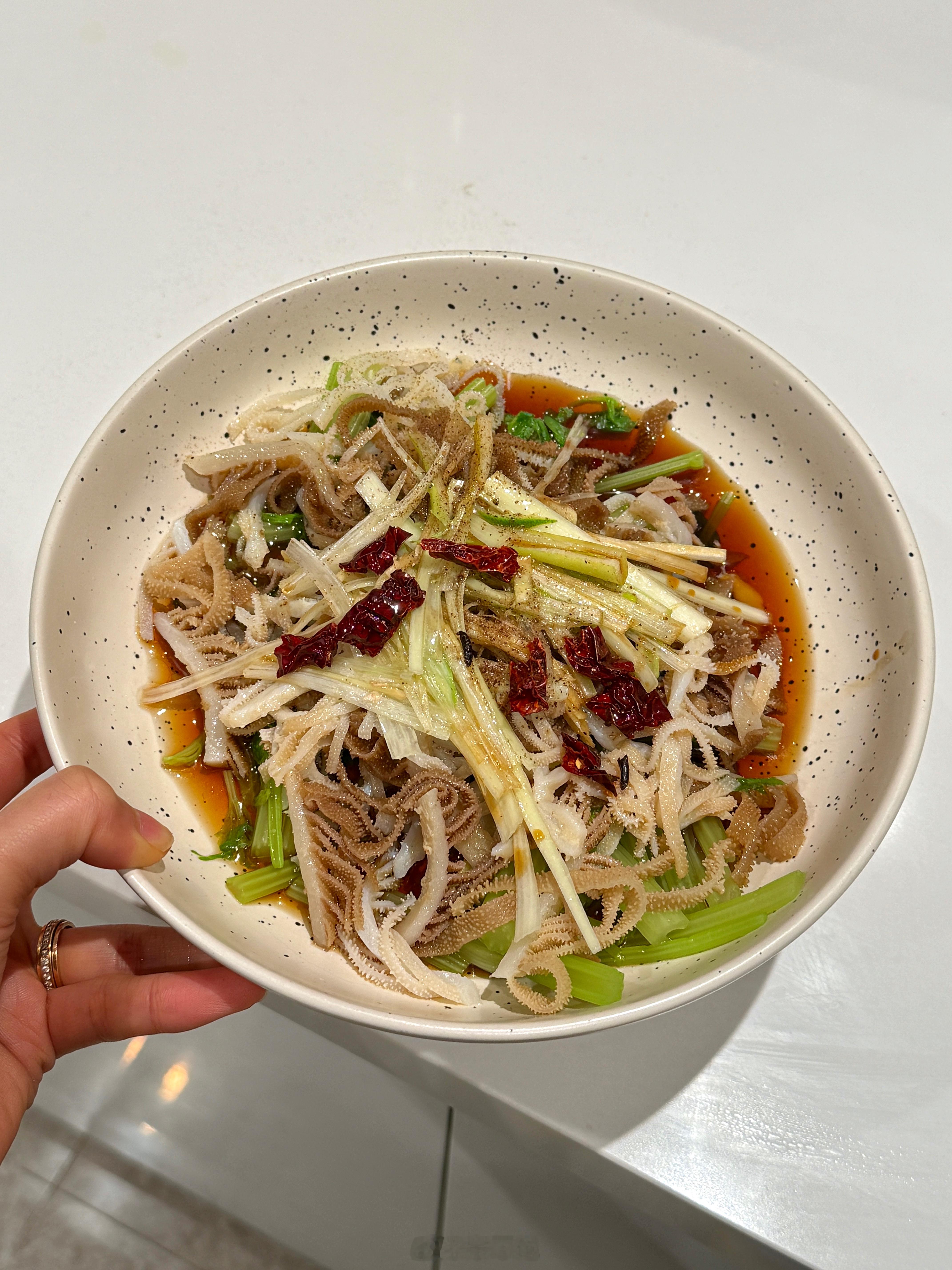 上个月去吃的油泼百叶,我和貂哥都还念念不忘,铺底的是焯烫过的芹菜,加点葱丝干辣椒姜丝和蒜末,我有点懒,就只用蒸鱼豉油+水+蚝油烧开倒上,撒了点花椒粉,热油泼了一下,十五分钟搞定,饭店味!