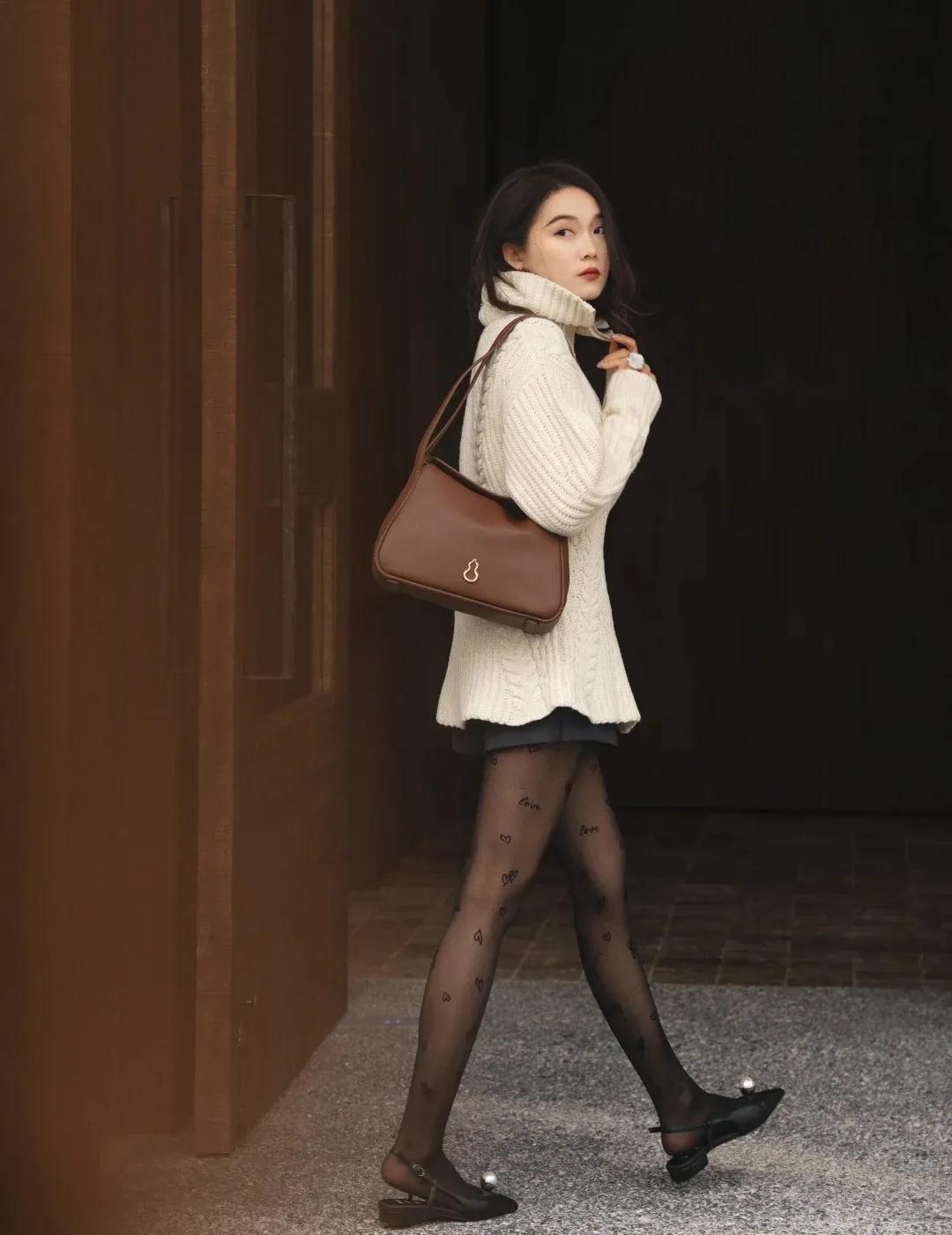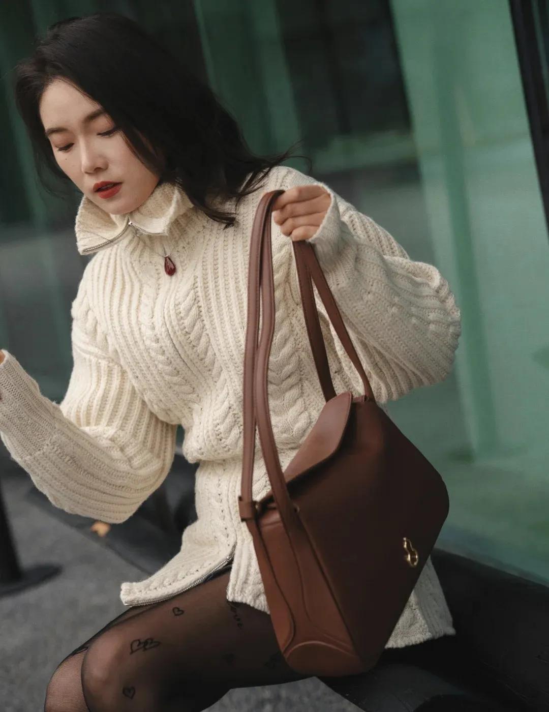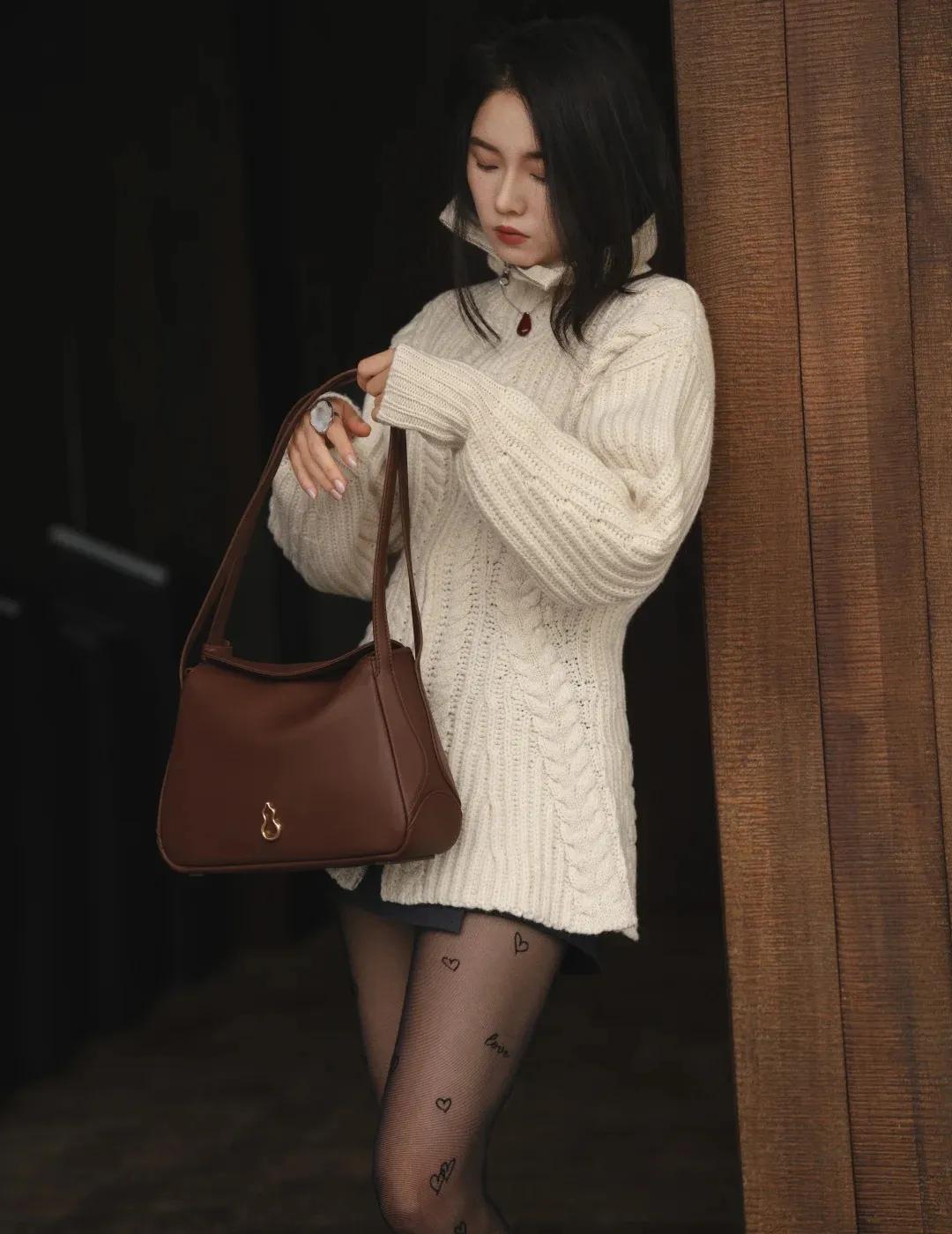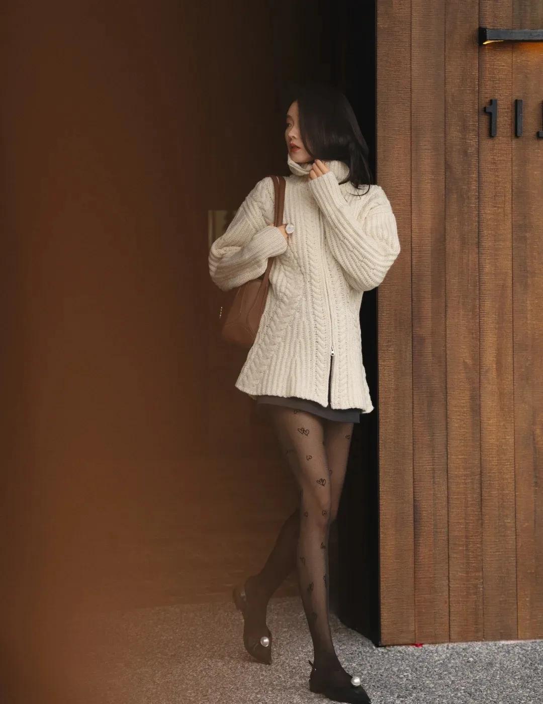 这套穿搭是温柔松弛的秋冬慵懒风,舒适又藏着精致细节。米白色粗线高领毛衣自带温暖慵懒感,拉链设计增加了穿搭的实用性,宽松版型营造出随性氛围;内搭的灰色短裙若隐若现,中和了毛衣的厚重感。 搭配带珍珠装饰的黑色单鞋精致温柔,与毛衣的柔和风格呼应;棕色大包简约实用,强化了整体的松弛质感。温柔风毛衣穿搭 针织温柔穿搭 高领毛衣穿搭