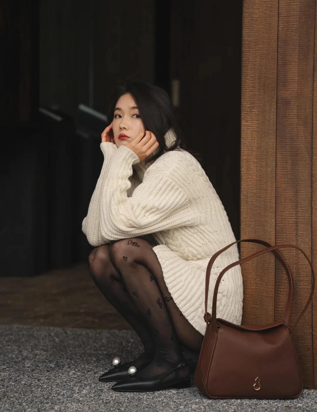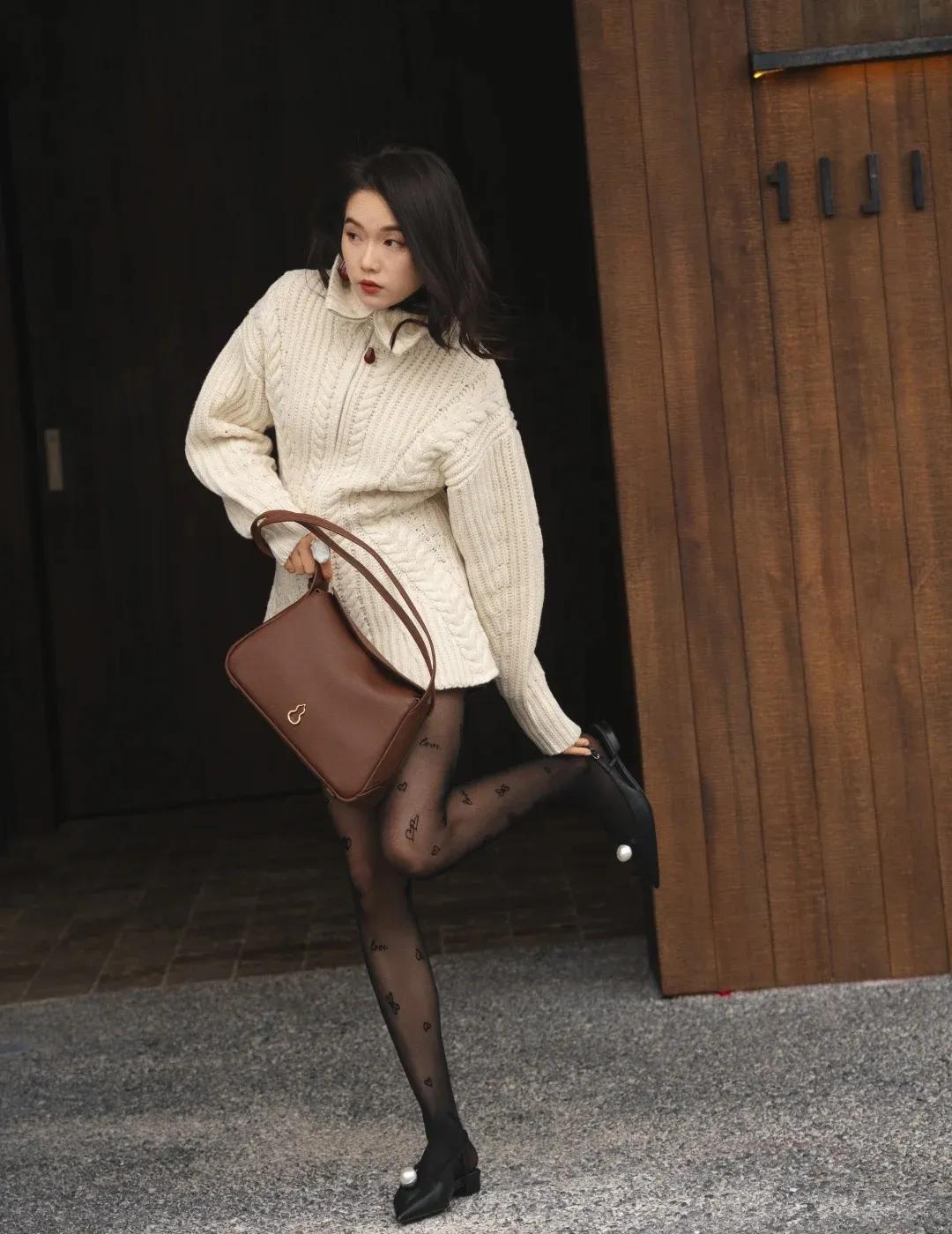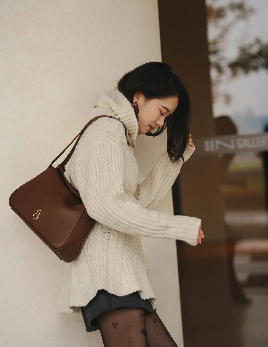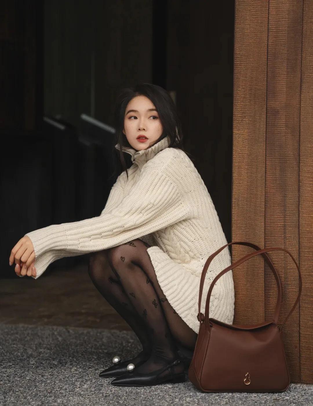 这套穿搭是温柔松弛的秋冬慵懒风,舒适又藏着精致细节。米白色粗线高领毛衣自带温暖慵懒感,拉链设计增加了穿搭的实用性,宽松版型营造出随性氛围;内搭的灰色短裙若隐若现,中和了毛衣的厚重感。 搭配带珍珠装饰的黑色单鞋精致温柔,与毛衣的柔和风格呼应;棕色大包简约实用,强化了整体的松弛质感。温柔风毛衣穿搭 针织温柔穿搭 高领毛衣穿搭