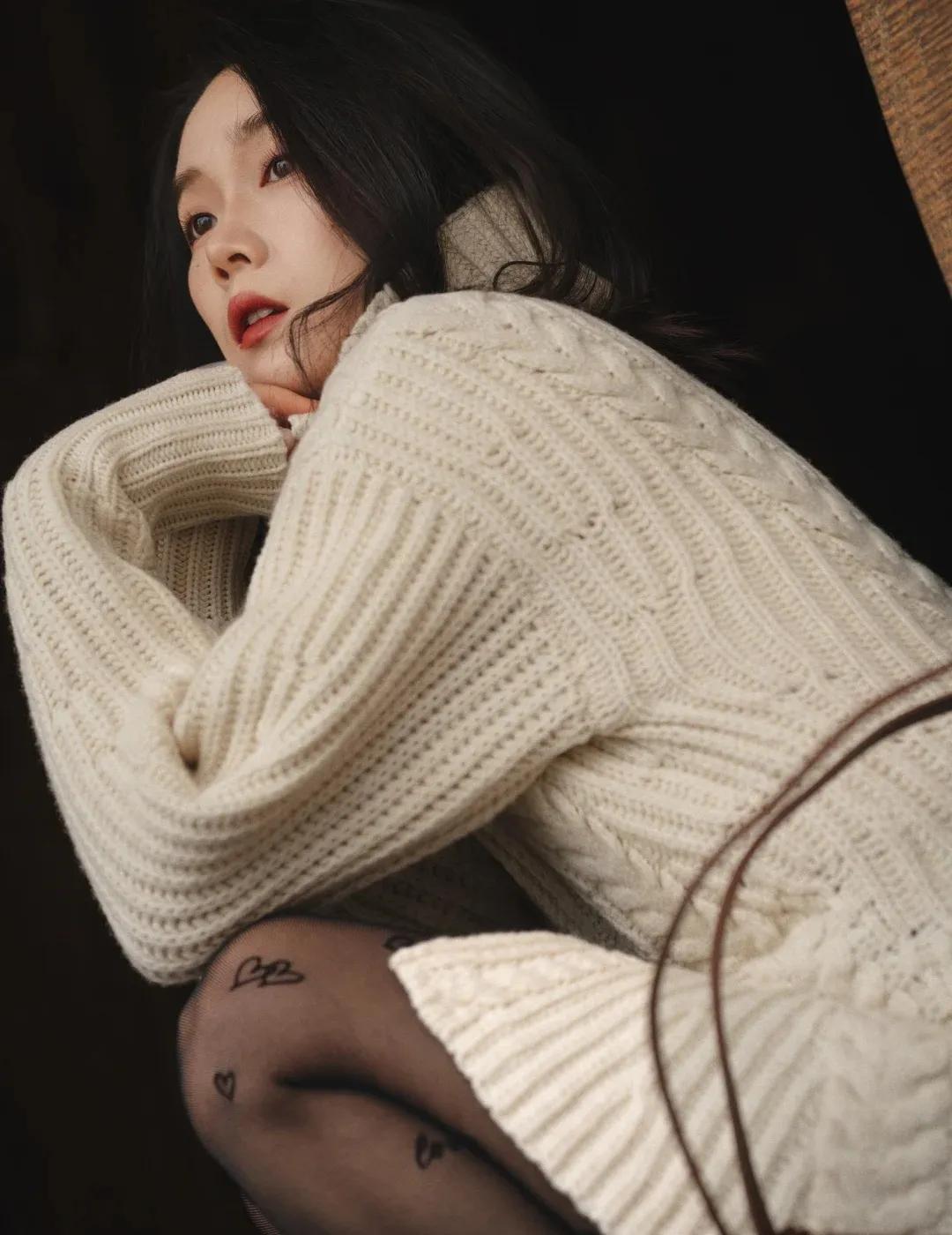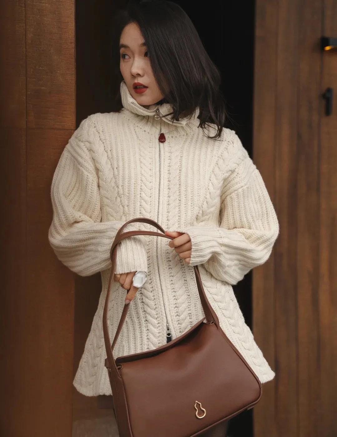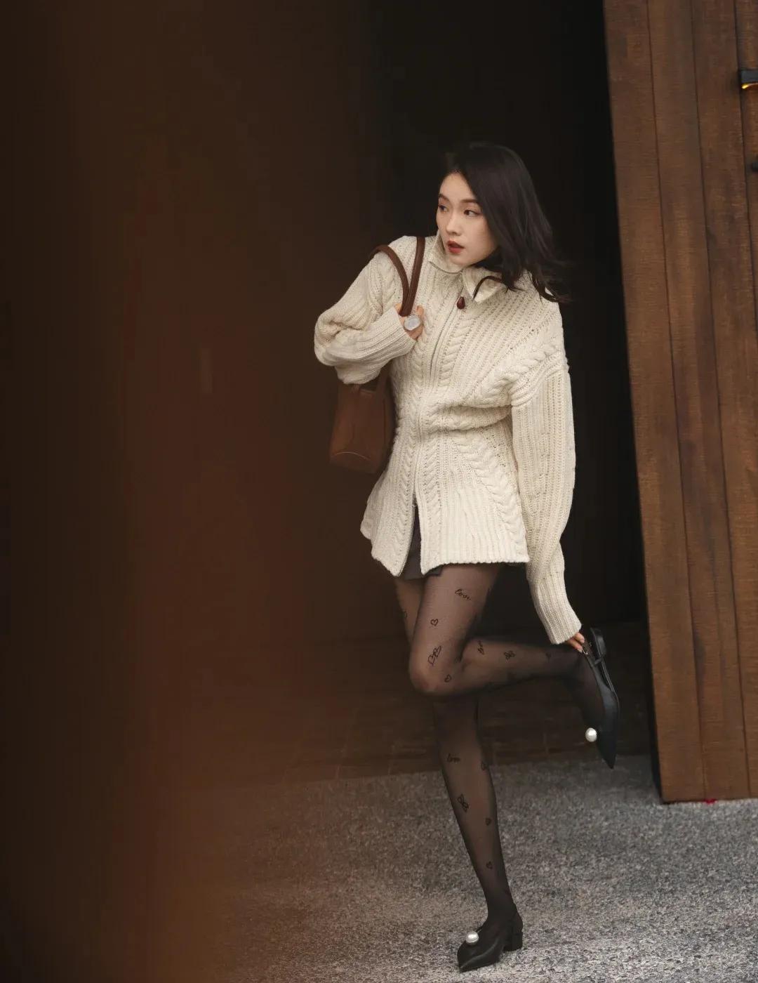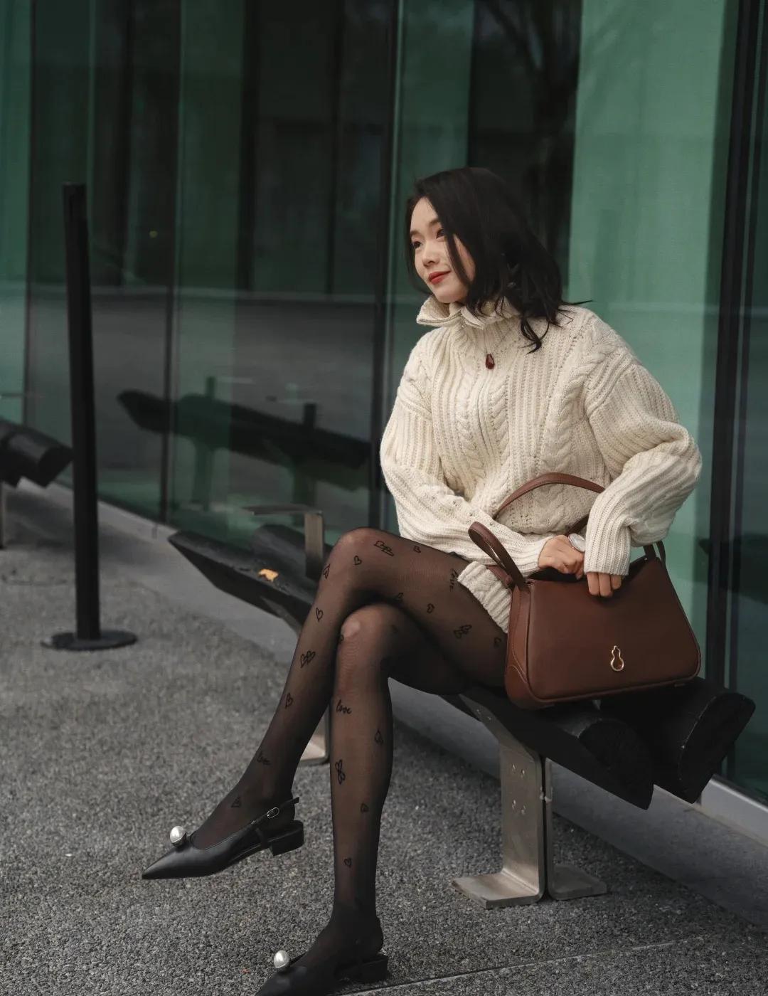 这套穿搭是温柔松弛的秋冬慵懒风,舒适又藏着精致细节。米白色粗线高领毛衣自带温暖慵懒感,拉链设计增加了穿搭的实用性,宽松版型营造出随性氛围;内搭的灰色短裙若隐若现,中和了毛衣的厚重感。 搭配带珍珠装饰的黑色单鞋精致温柔,与毛衣的柔和风格呼应;棕色大包简约实用,强化了整体的松弛质感。温柔风毛衣穿搭 针织温柔穿搭 高领毛衣穿搭