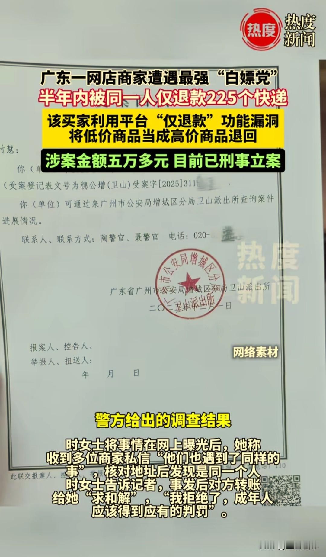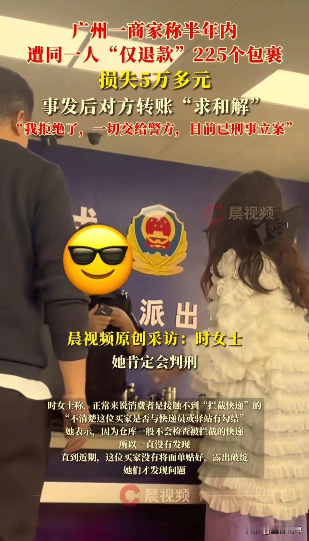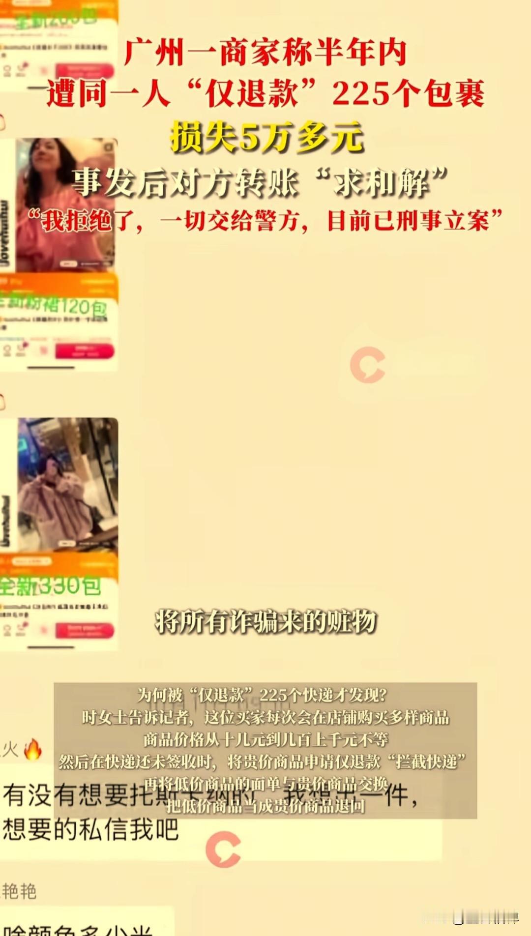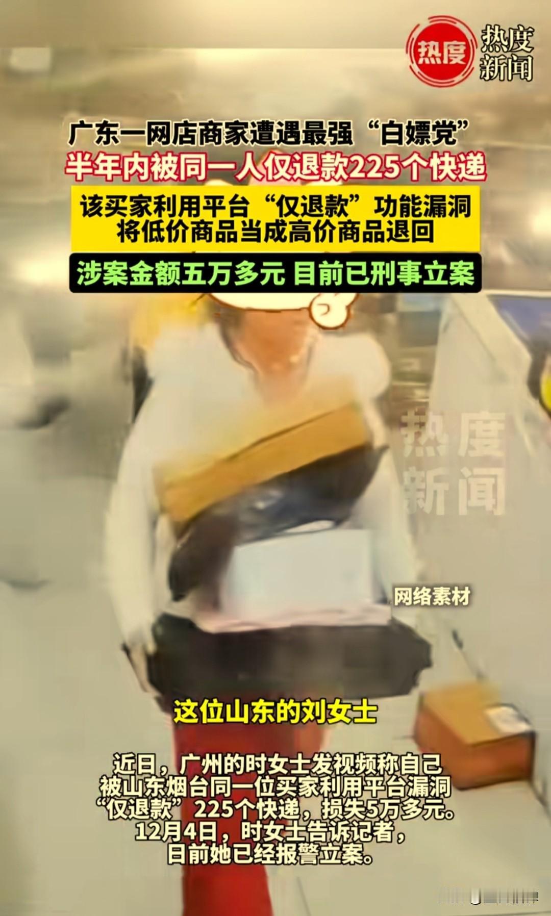 广东广州的商家时女士发视频称,一位山东烟台的买家,通过网店平台“仅退款”漏洞,将低价商品当成高价商品退回,在半年内退款225个快递,自己损失高达五万多元。 这名买家刘女士每次会同时购买高价值和低价值商品,利用快递在途中时申请“拦截”贵价的商品并退款,再将低价商品的物流单和高价商品调包退回,该行为已导致时女士损失超过5万元。 时女士说她也没想明白她是如何完成这个操作的,按正常来说拦截件她是接触不到的,没办法拆开去掉包的,她怀疑这名买家和快递员或者小区的菜鸟驿站有勾结。 这名山东烟台的嫌疑人刘女士,把这些诈骗来的商品在网上进行低价销售,她这边也报了警,警方也将此案定性为这是诈骗案件,警察说这位刘女士肯定会判刑。 时女士在网上曝光此事后,收到了其他商家的私信,称也遇到过类似的情况,核实地址后发现疑似为同一人所为。