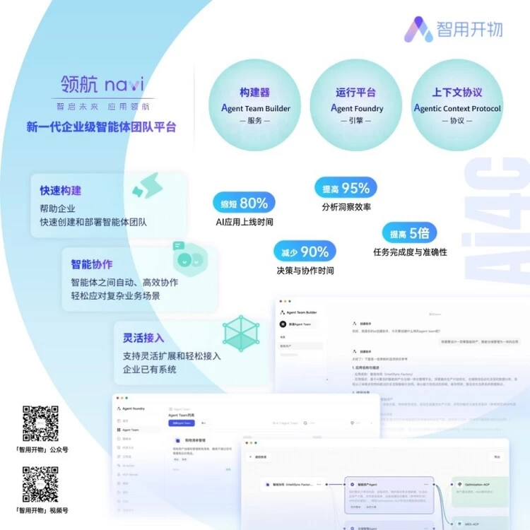 目前智用开物以「新一代企业级智能体团队平台“领航navi”」及其孵化场景应用为核心,并结合「AI项目价值评估系统“PRISM”」、「智用安全治理系统“AURA”」等多款周边辅助产品,构建完整的AI赋能产品矩阵。同时,智用开物已与全球500强企业共建“AI创新实验室”,携手多家IT企业打造“领航生态联盟”,联袂东盟国家头部IT企业开启跨国战略合作,并将持续秉承“赋能组织释放AI潜能,推动智能协作与创新落地”的使命,助力B端AI应用落地。
