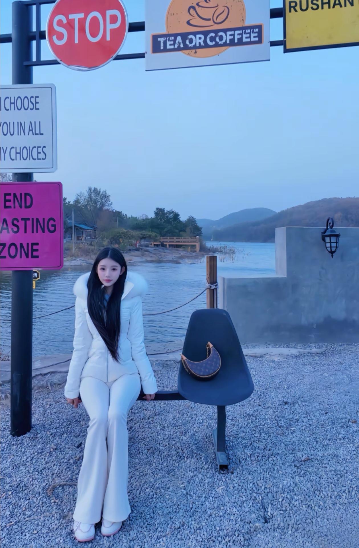 冬日湖畔,白衣少女静坐长椅,享受宁静时光。