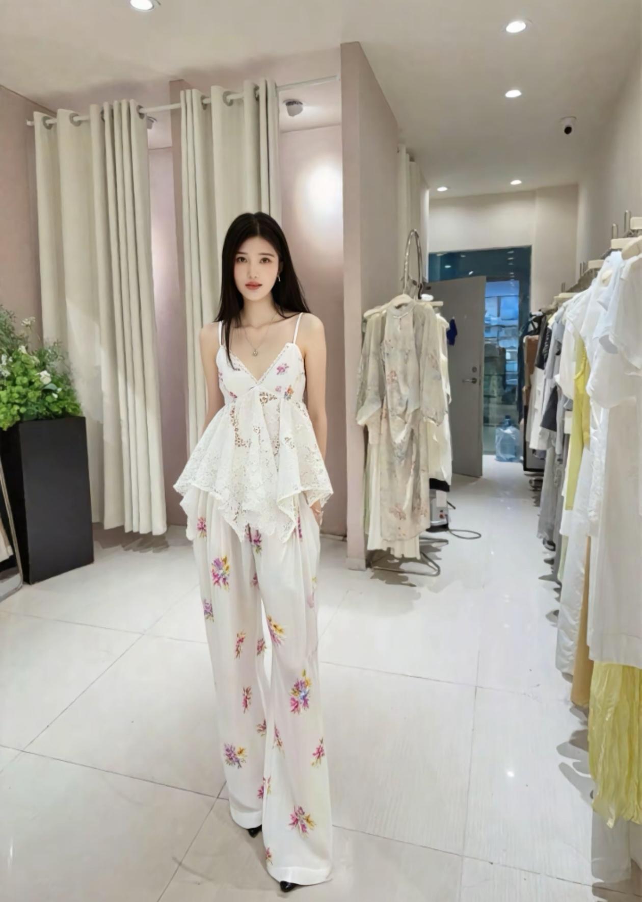 阳光下的优雅时光,粉色连衣裙与绿植相映成趣。