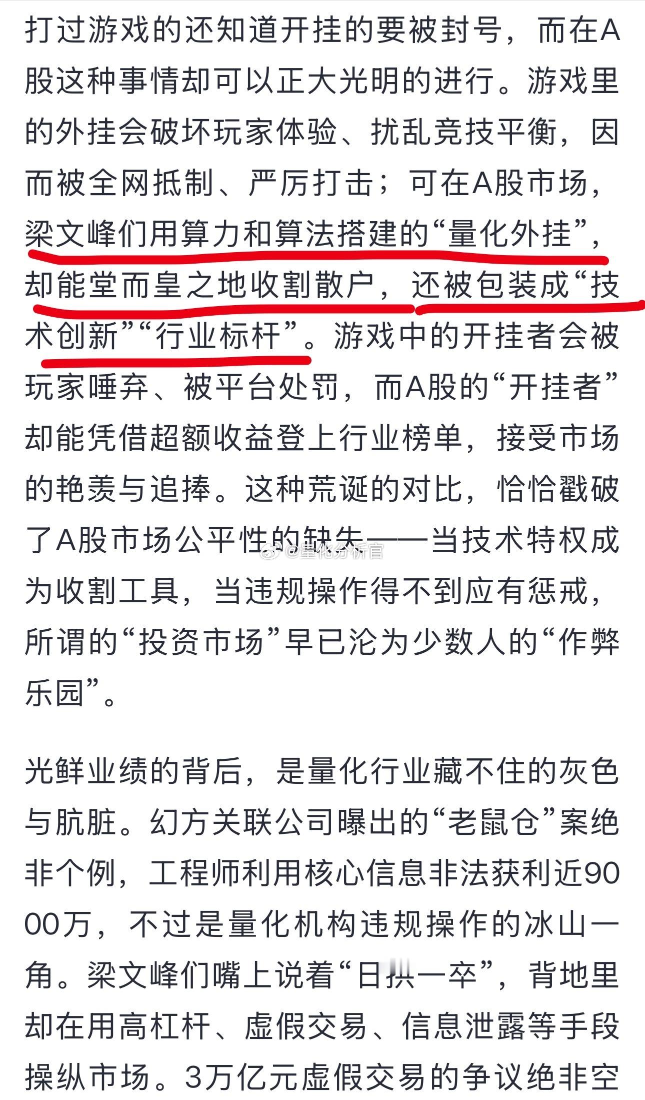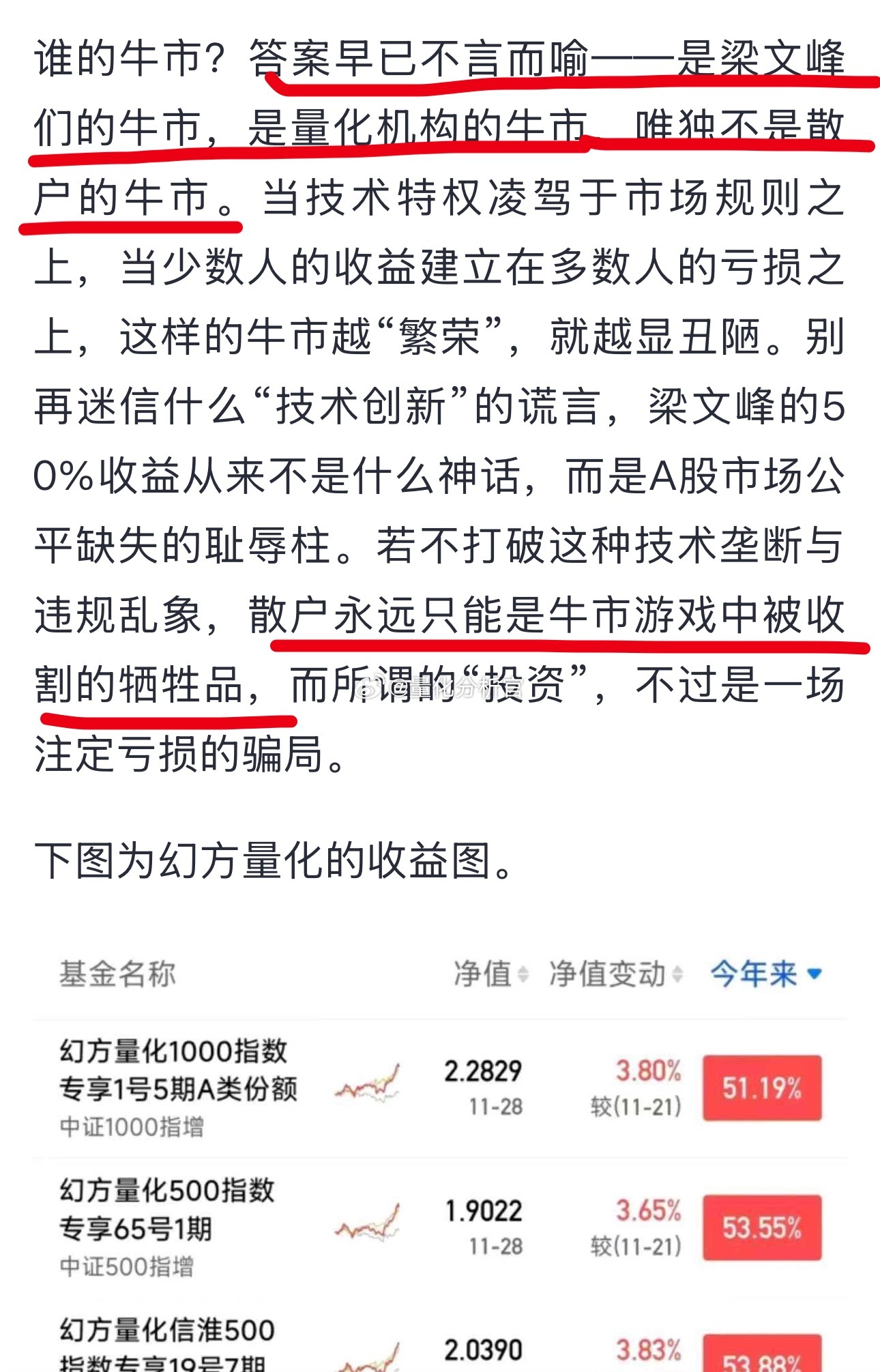 雪球上的热文—《这到底是谁的牛市?》,摘抄几句1、DeepSeek创始人梁文峰掌舵的幻方量化早已赚得盆满钵满——旗下产品平均收益高达50%,这哪里是什么全民共享的牛市,分明是少数人凭借技术特权掠夺财富的“狩猎场”2、梁文峰们用算力和算法搭建的“量化外挂”,却能堂而皇之地收割散户,还被包装成“技术创新”“行业标杆”3、这场牛市的真相,是少数人的狂欢与多数人的绝望。2025年量化产品备案量激增100%,头部机构像吸血鬼一样吸走市场大部分利润,而散户只能在“赚指数不赚钱”的困境中挣扎。4、高频交易制造的虚假波动,让散户的“追涨杀跌”变成必亏的陷阱5、谁的牛市?答案早已不言而喻——是梁文峰们的牛市,是量化机构的牛市,唯独不是散户的牛市。若不打破这种技术垄断与违规乱象,散户永远只能是牛市游戏中被收割的牺牲品,而所谓的“投资”,不过是一场注定亏损的骗局。A股 你支持量化交易吗