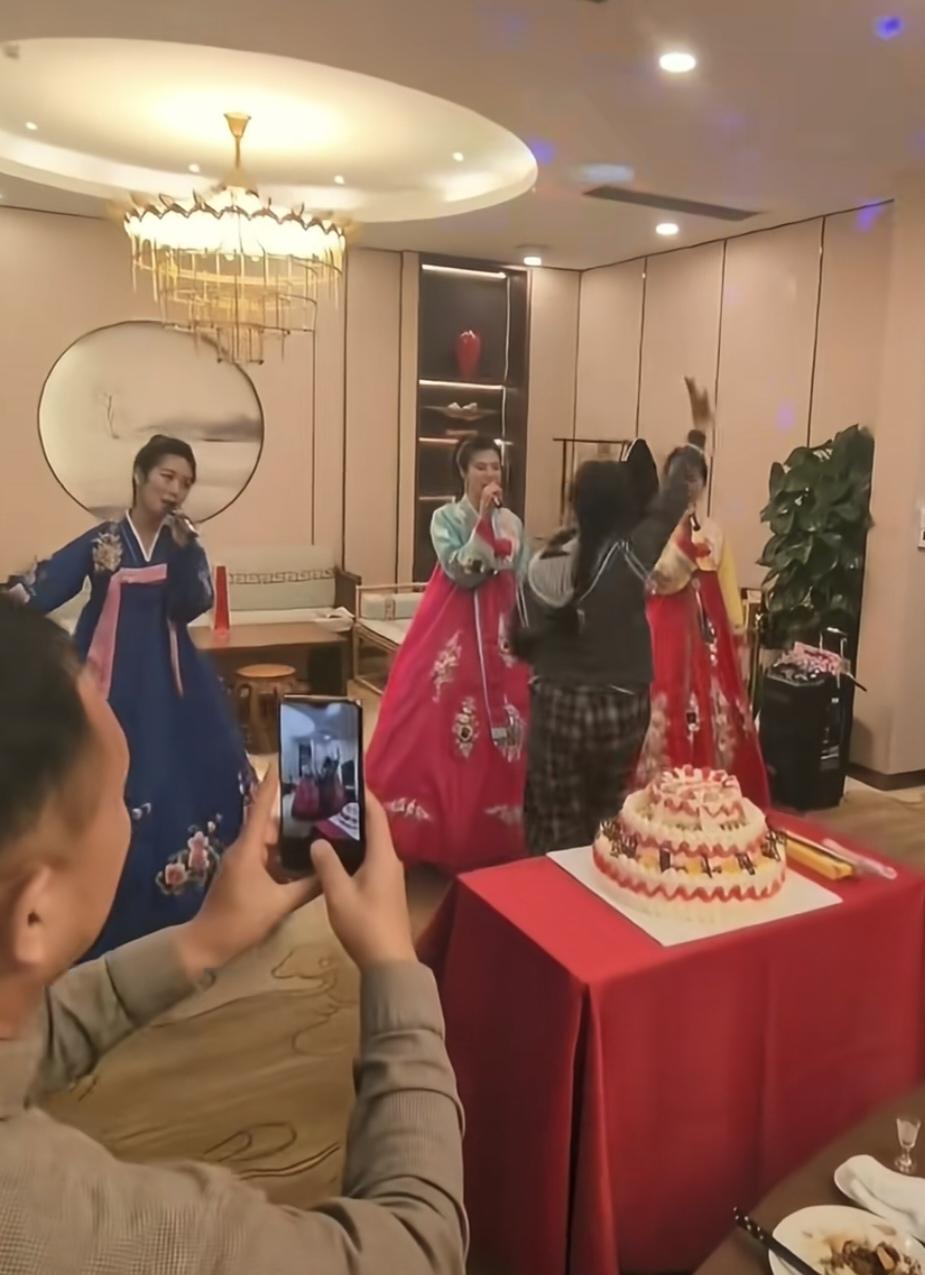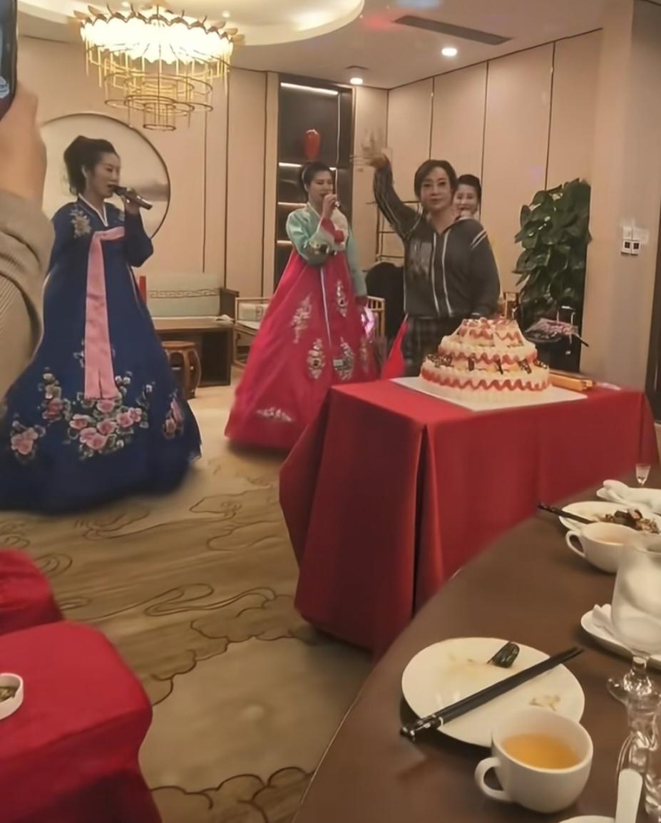 庆奶过生日,喜气洋洋啊:民族饭店来一波,朝鲜族饭店呗。载歌载舞来一波,服务员唱歌,刘晓庆伴舞。大蛋糕切一波,与朋友共享美味。生日宴来一波,与朋友们同把盏,深深地饮,深深地品。 灰色休闲套装,麻花辫,健康,无拘无束。75岁的年纪,活出中年人甚至青年人的印记。 古稀之年,还在拼工作,一路繁花二拍摄完毕后又开演短剧,扮演的是少女。无所不能,星依旧耀眼!祝她生日快乐!