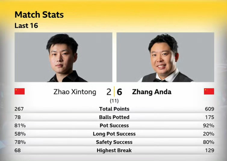 英锦赛第二轮中国德比大战中,张安达状态出色,以6-2战胜赵心童,连续第三年晋级英锦赛8强。张安达全场打出2个单杆破百(127、129)和4个单杆50+(87、79、69、64),赵心童最高打出单杆89。