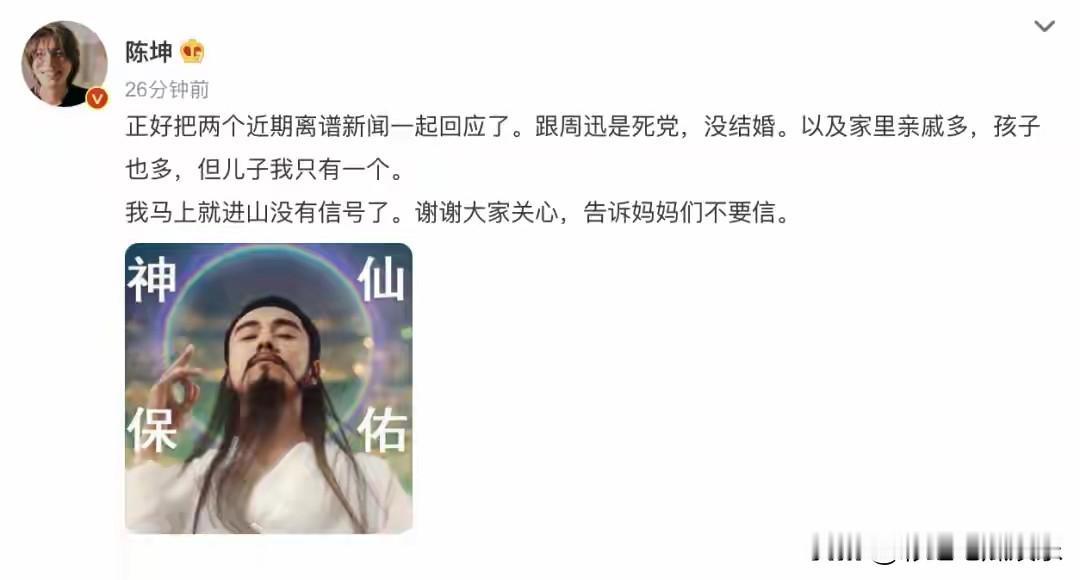 陈坤带双胞胎男孩出行被怀疑是儿子,陈坤早就辟谣了,儿子只有一个,双胞胎是亲戚家孩子。 陈坤和周迅是死党,早就澄清过,不知道为什么还有人误会他们领证生子真的很无语。 关于陈坤儿子的亲妈是谁,我觉得已经不重要了,也许是陈坤好心捡的,只要孩子过得好就够了。多关心作品,少八卦私生活。