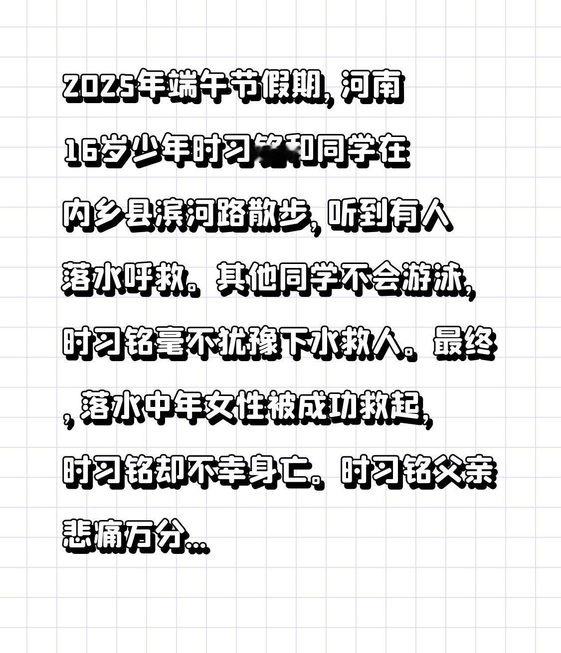2025年端午节假期,河南16岁少年时习铭和同学在内乡县滨河路散步,听到有人落水呼救。其他同学不会游泳,时习铭毫不犹豫下水救人。最终,落水中年女性被成功救起,时习铭却不幸身亡。 时习铭父亲悲痛万分,孩子母亲更是天天以泪洗面。这个40岁的父亲,家里两个孩子,大儿子懂事独立,常帮家里打理早餐店,还曾说想当兵。夫妻俩本盼着成绩优异的儿子考个好大学,如今希望破灭。意外发生后他们准备转让店铺时习铭