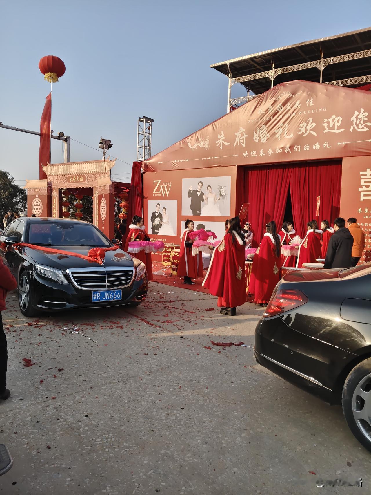 今天上班路上可太热闹了!刚拐进村道,就瞅见两边挂得满是红灯笼、小彩旗,连路灯杆都插了国旗,喜庆得晃眼。 凑近一瞧,原来是朱府办婚礼!搭了老大的红帐篷,门口姑娘们裹着红斗篷,还有黑奔驰婚车扎着红花。炮仗屑铺了一地,空气里都飘着甜丝丝的热闹劲儿。 这大清早的喜事儿,把我上班的困劲儿都冲没啦!