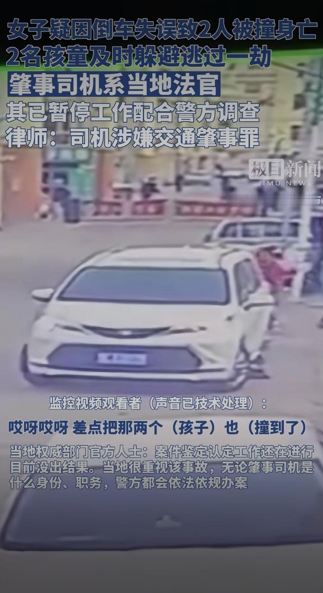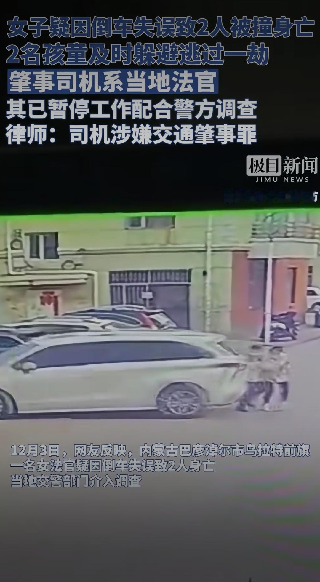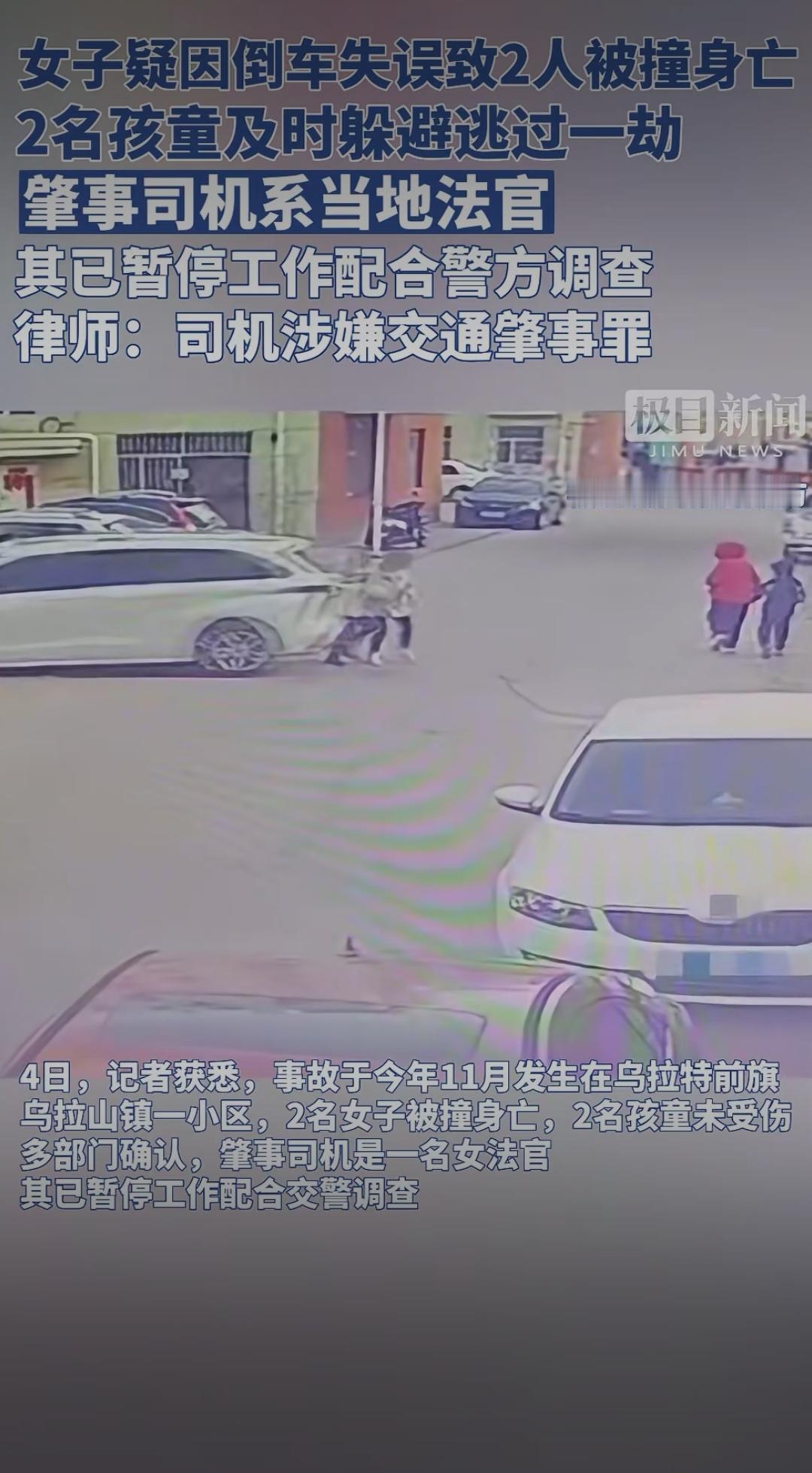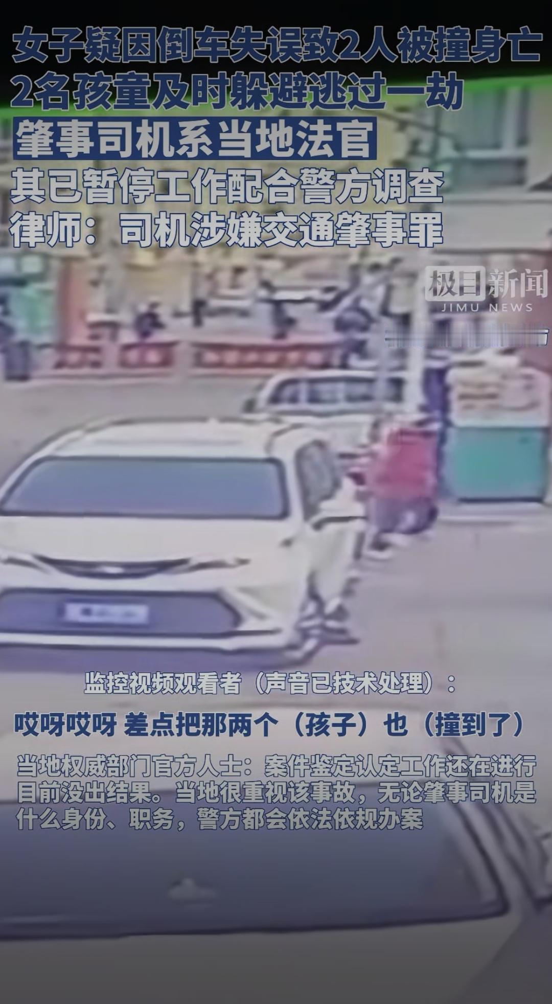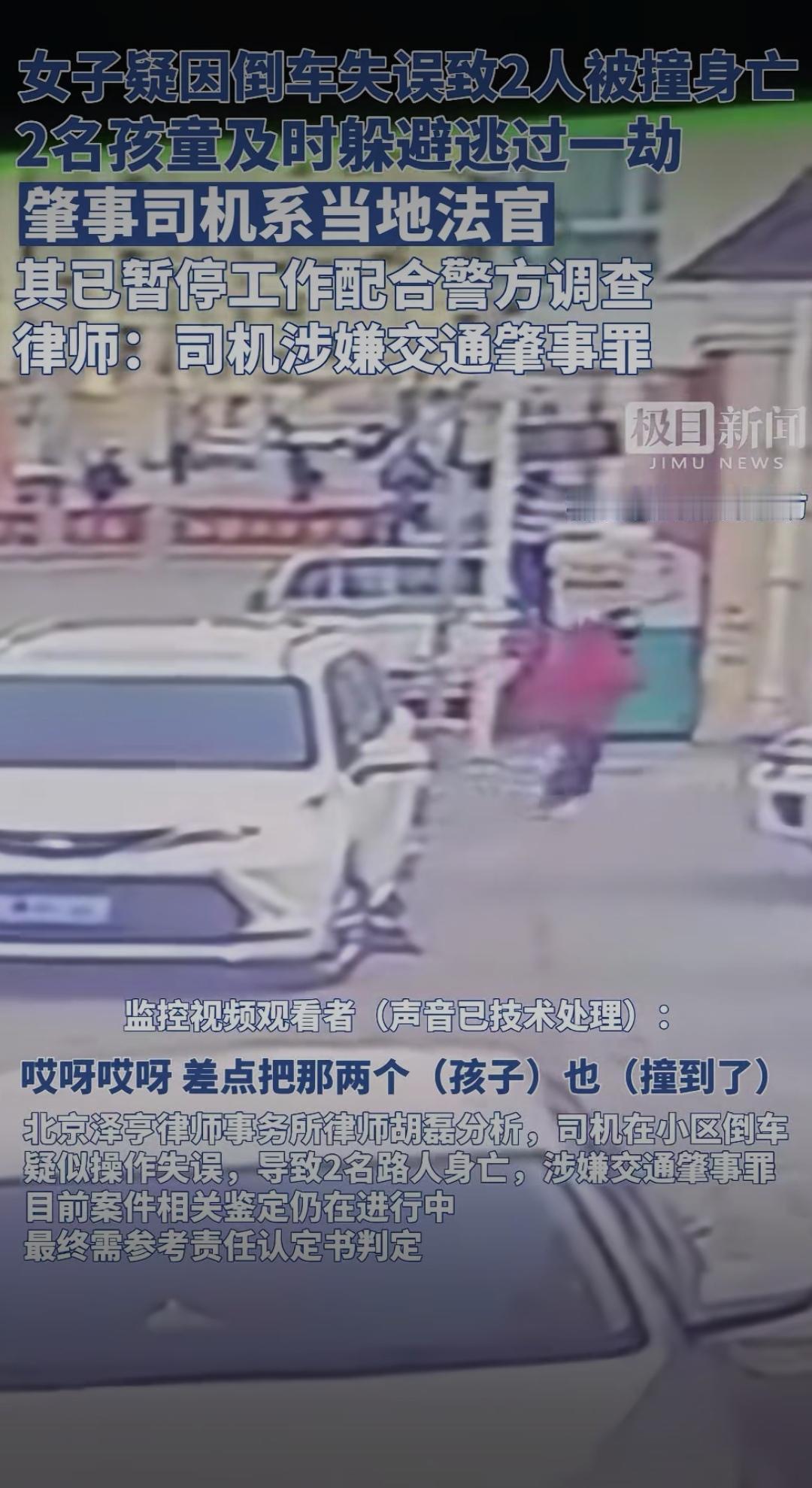 法官倒车致2人遇难:身份不是免责符,法治面前人人平等女法官交通肇事 女子疑因倒车失误致2人被撞身亡,2名孩童及时躲避逃过一劫,肇事司机系当地法官,其已暂停工作配合警方调查,律师:司机涉嫌交通肇事罪。 这则消息一出,瞬间引发全网热议。据现场目击者透露,事发当天下午,某小区内一名女子驾车倒车时,疑似未观察后方路况,车辆突然加速后退,径直撞上路边闲聊的两位老人。巨大的冲击力让两位老人当场倒地,虽被紧急送往医院抢救,但最终因伤势过重不幸离世。万幸的是,原本在附近玩耍的两名孩童,因及时跑开躲过了这场劫难,仅受到轻微惊吓。 随着调查深入,肇事司机的身份被曝光——当地法院的一名法官。这一身份让事件迅速发酵,网友们的讨论炸开了锅:“法官本该是法治的践行者,怎么会犯下这样的过失?”“身份再特殊,也不能凌驾于法律之上”“希望调查公正透明,给遇难者家属一个交代”。 据悉,事发后涉事法官已暂停所有工作,全力配合警方调查。法律人士分析,根据目前掌握的情况,该司机涉嫌交通肇事罪,若调查确认其存在操作失误、未尽到安全注意义务等情形,将依法承担相应的刑事责任。而无论其身份如何,在法律面前都应一视同仁,不存在任何特权。 这起悲剧让人痛心,两位老人的离世给家属带来了无法弥补的伤痛。更值得深思的是,法官作为执掌司法公正的专业人士,本应是法律的标杆,更应严格遵守法律法规。此次事件也提醒我们:无论身份高低、职业贵贱,遵守交通规则、敬畏生命都是每个人的基本责任。 法律的尊严在于公平公正,越是手握公权的人,越应以身作则。网友们的关注,本质上是对公平正义的期盼。希望相关部门能尽快查清事实,依法依规处理,既告慰逝者,也维护法律的严肃性。你如何看待这起事件?要不要我帮你梳理观点,形成更具深度的评论文案?