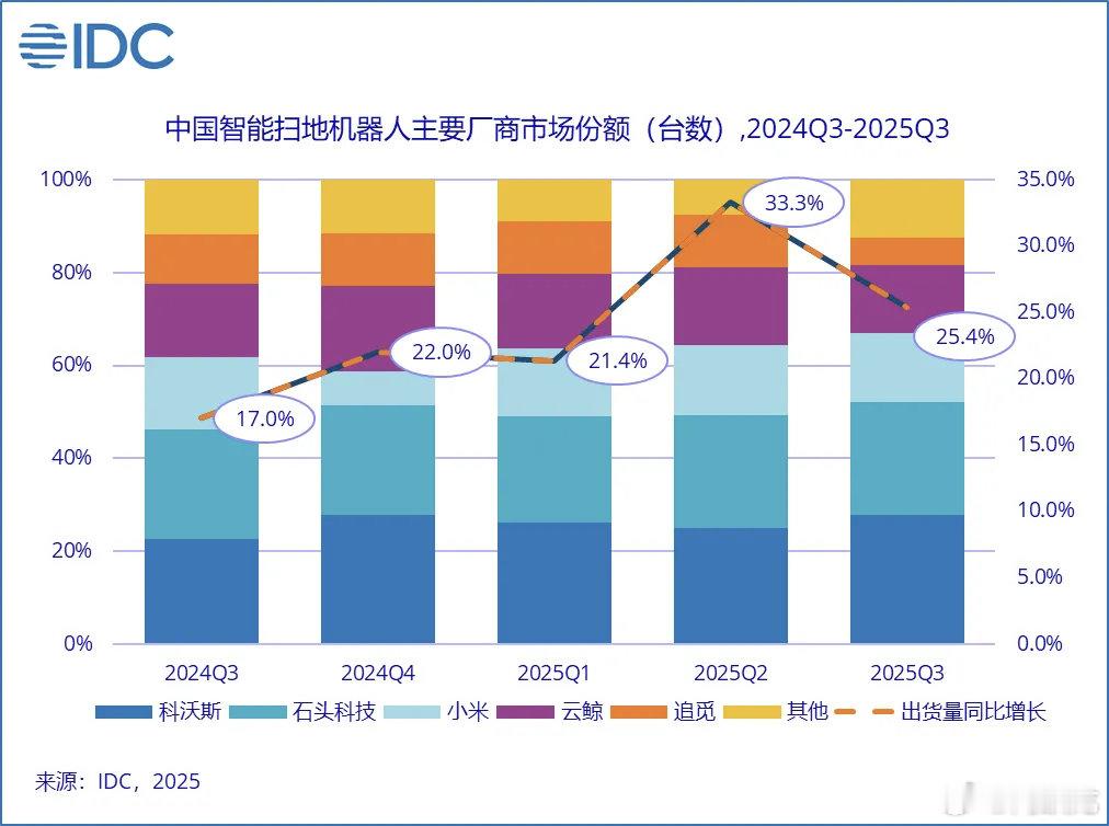 2025年第3季度全球扫地机器人市场,中国厂商包揽全球出货量前五。