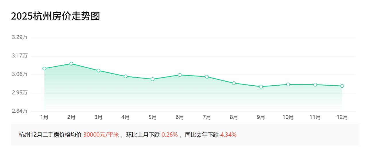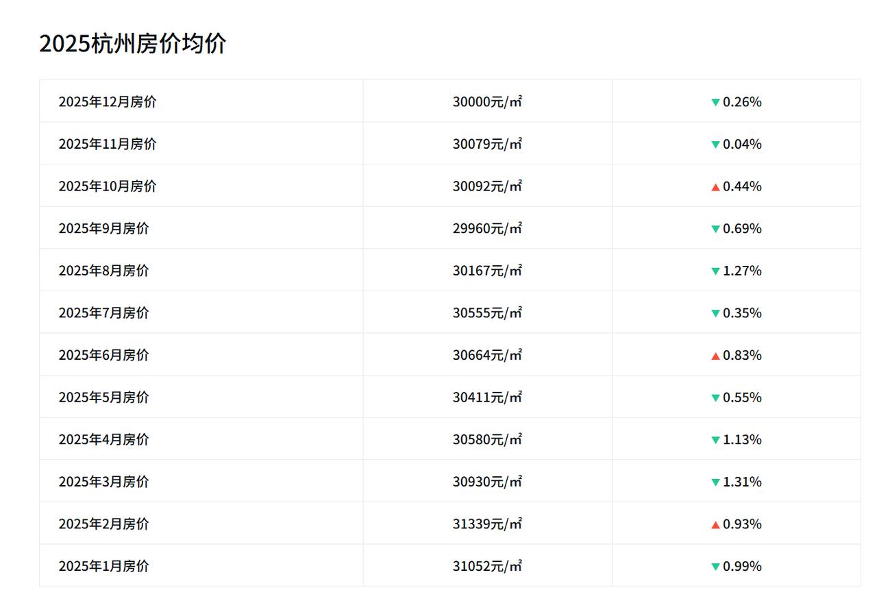 2025年1月,杭州房价均价31052元; 2025年2月,杭州房价均价31339元; 2025年3月,杭州房价均价30930元; 2025年4月,杭州房价均价30580元; 2025年5月,杭州房价均价30411元; 2025年6月,杭州房价均价30664元; 2025年7月,杭州房价均价30555元; 2025年8月,杭州房价均价30167元; 2025年9月,杭州房价均价29960元; 2025年10月,杭州房价均价30092元; 2025年11月,杭州房价均价30079元。   数据显示,2025年1-11月,杭州房价呈现明显波动,均价从1月的31052元到11月的30079元,降幅约3.1%。   特别是今年以来,杭州的新房市场表现强劲,二手房市场则相对疲软。杭州二手房的成交结构发生了根本变化,低价刚需房和学区房成为二手房市场的主力军。   当下的杭州楼市,整体已进入“买方市场”,购房者的选择空间更大,议价能力更强,对于开发商而言,产品力将成为核心竞争力。