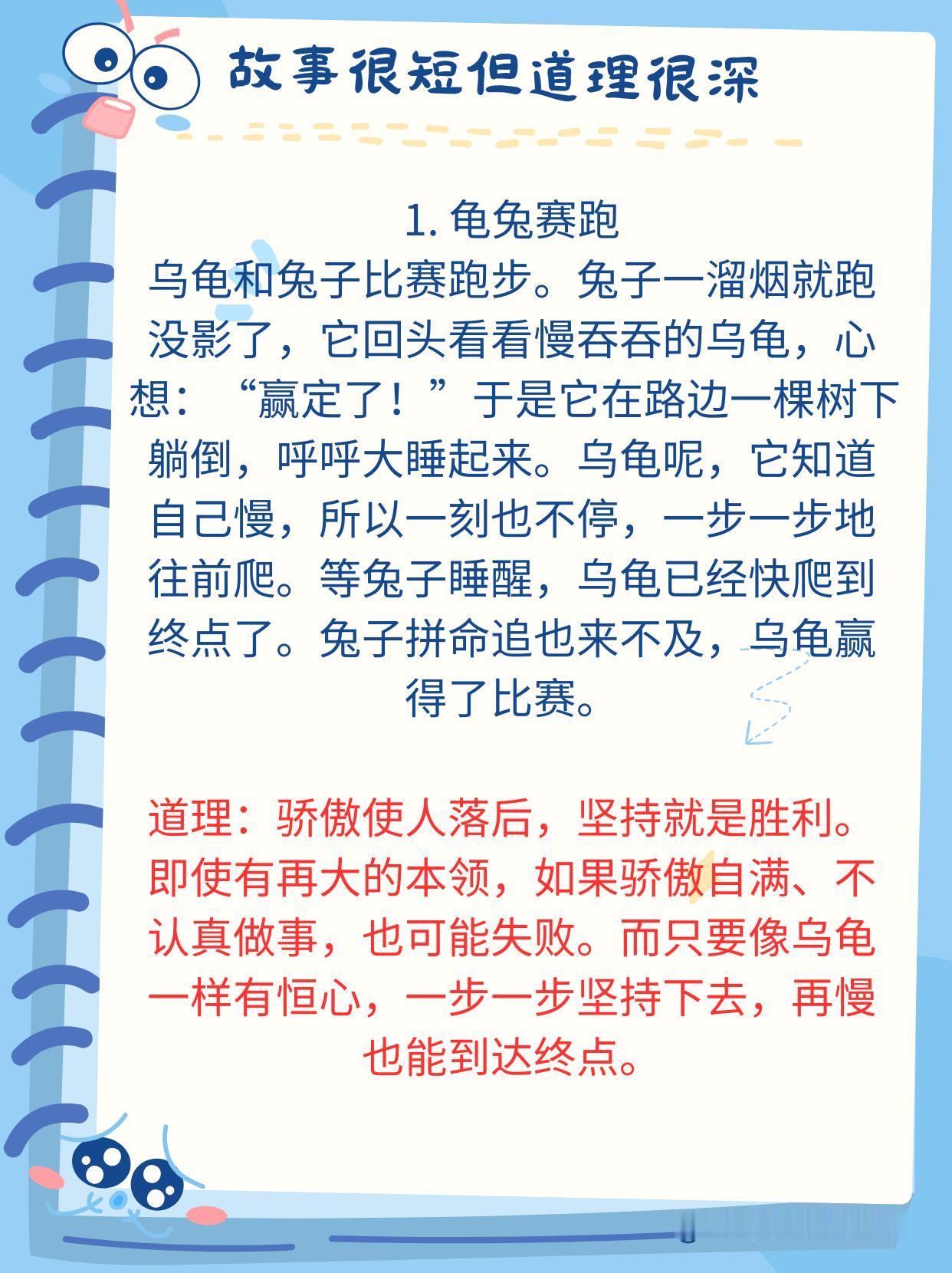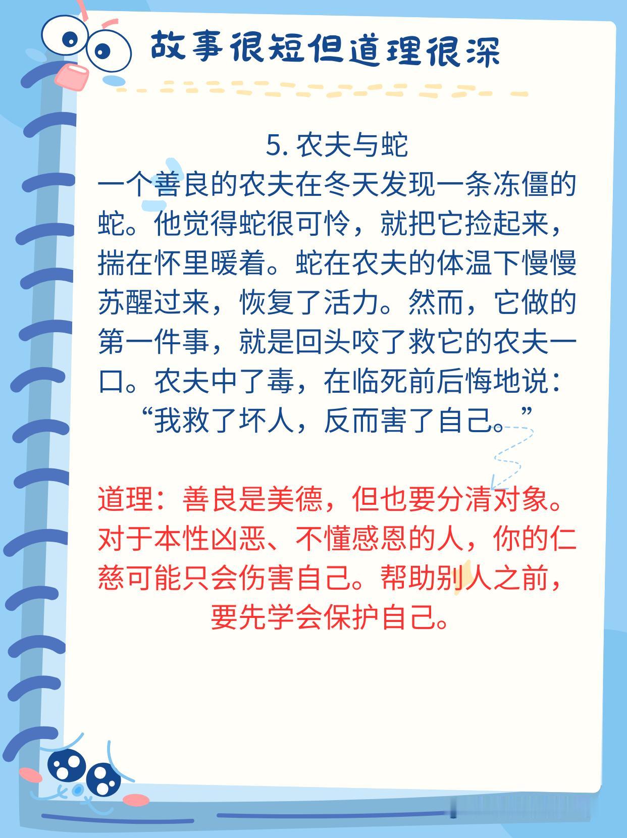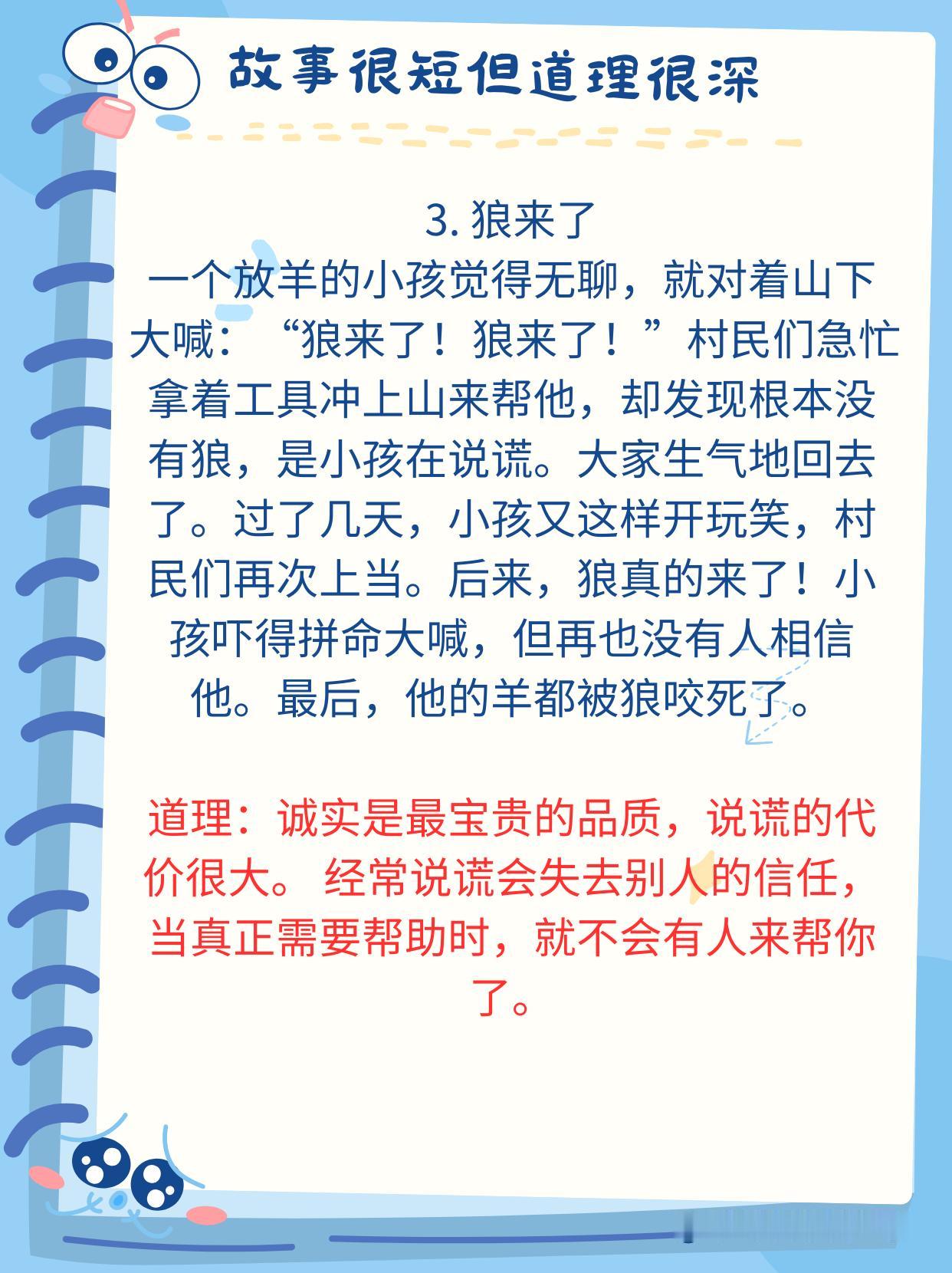 神经科学研究发现:人的大脑对故事的反应远远强于抽象的道理。当孩子听故事时,大脑中负责处理自我反思、道德判断和情感共鸣的默认模式网络(DNM)会被激活。 比如,当你给孩子讲《狼来了》的故事时,他不仅能理解“说谎话的后果”更能通过角色带入体验恐惧和信任的崩塌感。 这种效果比单纯的告诉他“好孩子不撒谎”的效果好的多的多。 没事的时候,多给孩子讲一讲小故事,尤其是下面这些经典的,蕴含深刻人生哲理的小故事。 建议家有孩子的收藏起来,没事的时候读一读,趁孩子睡前或者抓住生活的契机,给孩子讲一讲,对于他们未来的学习和生活都有很大的好处,能少走不少弯路,少吃很多亏!