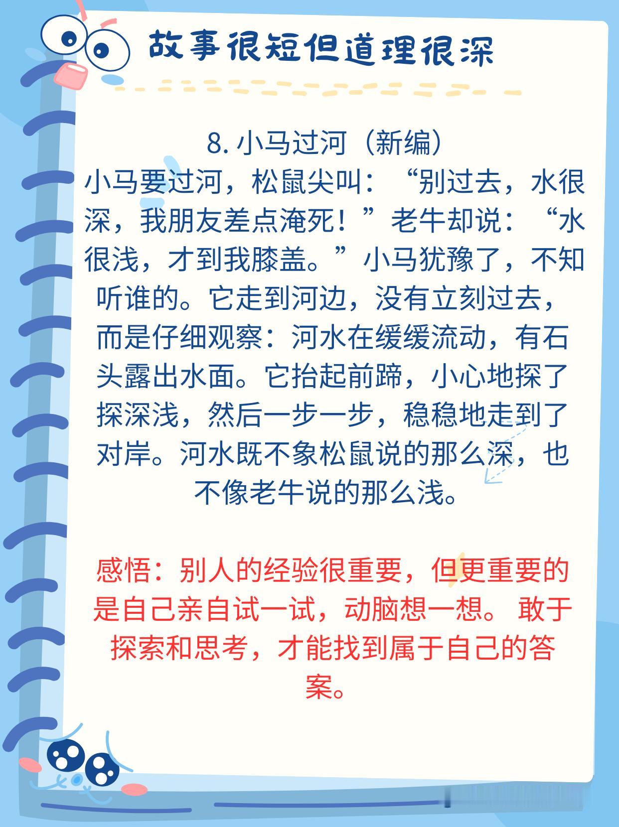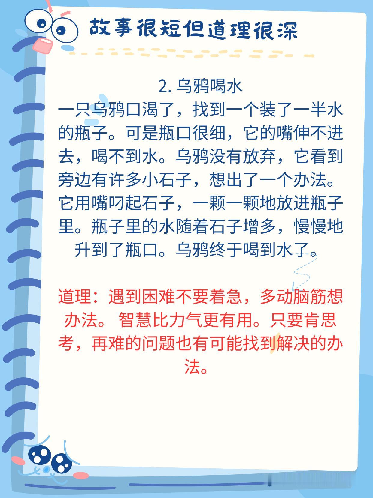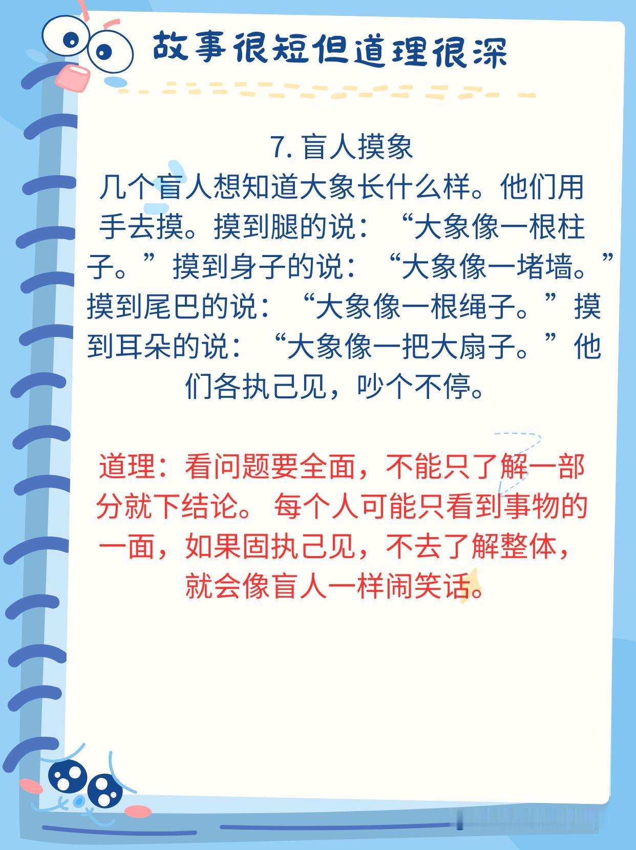 神经科学研究发现:人的大脑对故事的反应远远强于抽象的道理。当孩子听故事时,大脑中负责处理自我反思、道德判断和情感共鸣的默认模式网络(DNM)会被激活。 比如,当你给孩子讲《狼来了》的故事时,他不仅能理解“说谎话的后果”更能通过角色带入体验恐惧和信任的崩塌感。 这种效果比单纯的告诉他“好孩子不撒谎”的效果好的多的多。 没事的时候,多给孩子讲一讲小故事,尤其是下面这些经典的,蕴含深刻人生哲理的小故事。 建议家有孩子的收藏起来,没事的时候读一读,趁孩子睡前或者抓住生活的契机,给孩子讲一讲,对于他们未来的学习和生活都有很大的好处,能少走不少弯路,少吃很多亏!