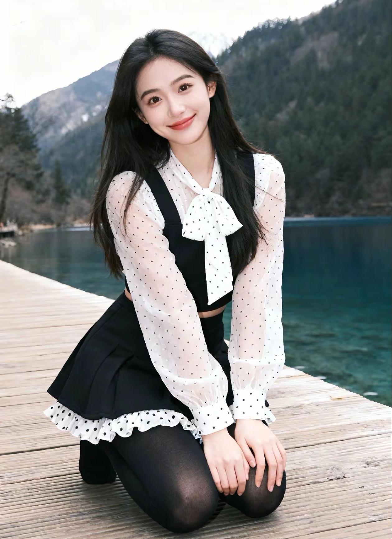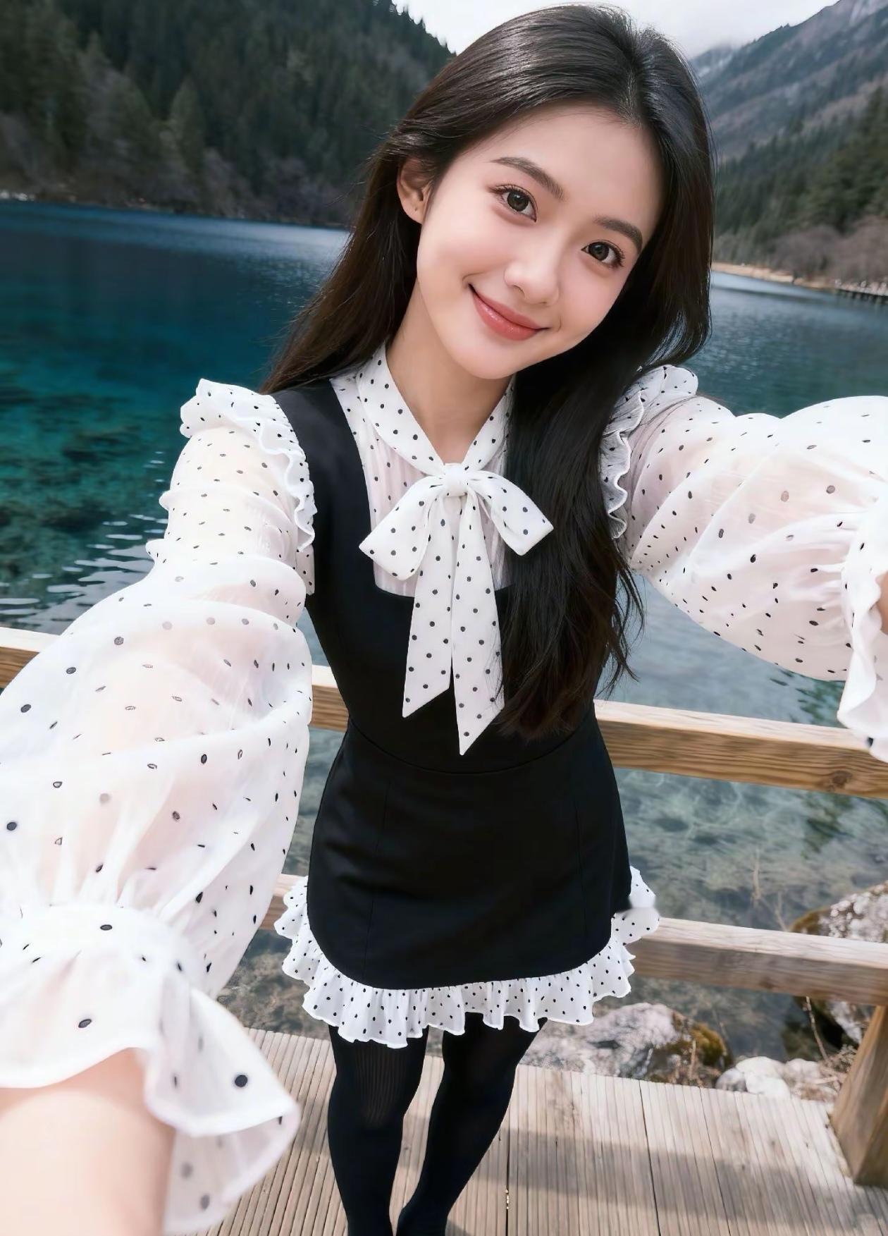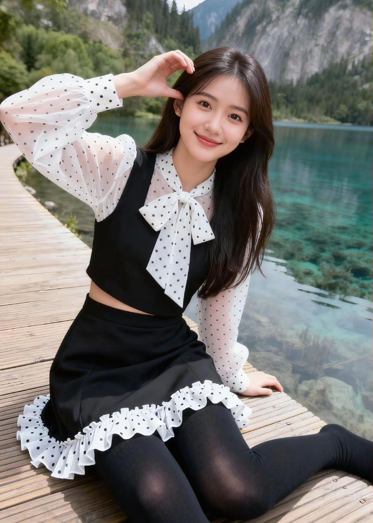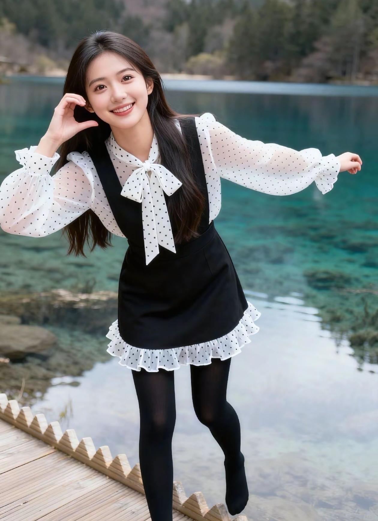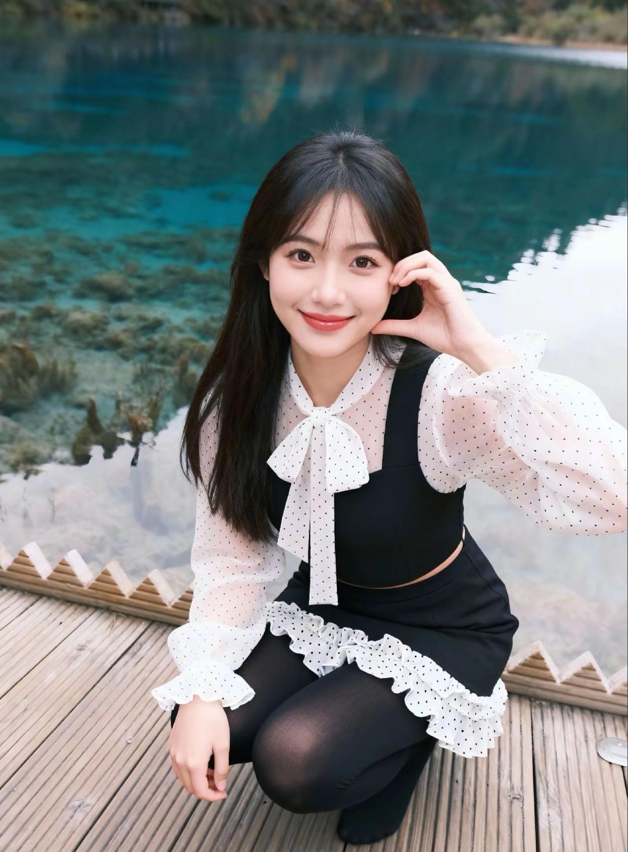 少女在湖边比V,青春洋溢,风景如画!🌿💖