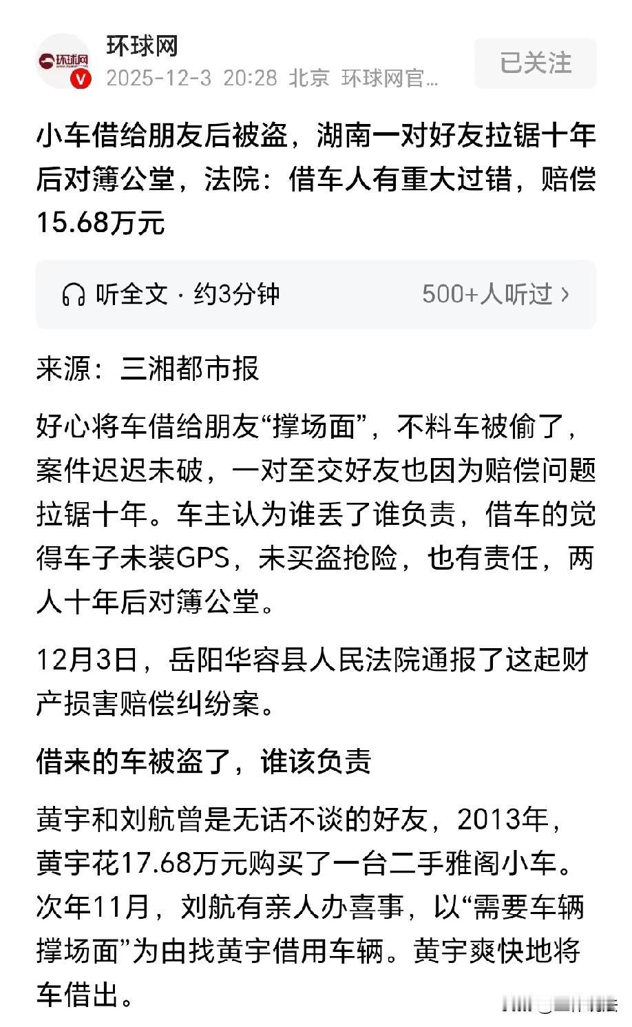 车和媳妇概不外借!湖南岳阳,男子花17.68万买了辆二手雅阁,朋友参加婚礼需要撑场面找他借车,男子非常仗义,很爽快的把车借了出去。不成想,车辆停在监控盲区被盗,公安机关寻找无果后,男子向朋友索赔20万。朋友竟然振振有词:要不是车辆没装GPS,没买盗抢险,也不会造成这么多损失,男子也有责任,他最多赔偿3万元,还要分期支付。双方为此争执十年没有定论,闹上法院后,法院判了! 2013年,男子黄宇花17.68万拿下一辆二手雅阁,车刚到手那会儿,他宝贝得不行,经常把车擦的锃亮锃亮。 黄宇和刘航是从小玩到大的铁哥们,平时有事互相搭把手,关系好得没话说。 2014年11月,刘航家里有亲人办喜事,特意找到黄宇,一脸诚恳地表示:兄弟,我家办喜宴,想借你这车撑撑场面,就用一天,保证完璧归赵。 黄宇有些为难,但又觉得不借车的话太不给兄弟面子了,终究还是仗义占了上风,很爽快的把车借了出去。 本以为就是好兄弟之间的好心帮忙,没想到惹来了不小的麻烦。 婚宴结束后,刘航想着就去附近酒店休息几个小时,应该没啥事,便把车随意停在了小区大门右边的公路边。 他当时没多想,压根没注意这地方是监控盲区,视线还特别隐蔽。 等他休息完出来,眼前的一幕让他瞬间慌了神,雅阁车不见了。 刘航急得满头大汗,沿着公路边找了好几圈,可连车的影子都没看着。 他赶紧给黄宇打了电话,报告了车辆丢失的情况。 黄宇一听这话,心里咯噔一下,他实在不敢相信,好好的车怎么会丢? 两人在原地找了大半夜,还是没找到车,只好硬着头皮报了警。 可因为停车的地方没监控,根本查不到车辆丢失的线索,这案子一立,就成了悬案,至今都没侦破。 车找不回来,赔偿的事就成了两人之间的疙瘩。 黄宇觉得,车是刘航弄丢的,他就该全额赔偿,自己当初那么信任他,把宝贝车借给他,结果落得这个下场,说什么也得照价赔偿。 可刘航却不这么想,他觉得车丢不是自己一个人的错,这车没装GPS,也没买盗抢险,造成这么大的损失,黄宇也有很大责任。 曾经的铁哥们,因为赔偿问题吵得不可开交。十年间,两人从偶尔争执到见面就掐,当初的友情在一次次拉扯中慢慢消磨殆尽。 刘航后来提出赔偿3万元,但得分期还清,每个月付500元。 黄宇一听就火了:我车买的时候花了17万多,你赔3万还分期,这不是打发人吗? 双方谈了无数次,始终没达成一致。 今年3月,黄宇实在忍无可忍,把刘航告上了法院,索赔20万元。 法庭上,刘航还是坚持自己的说法,认为黄宇没装GPS,这才导致公安机关迟迟找不到车。 而且黄宇没买盗抢险,要是有保险,也损失不了这么多,这些损失里面,黄宇有很大的责任。 对此,法院会如何审理呢? 依据《民法典》第八百九十七条规定:保管期间,因保管人保管不善造成保管物毁损、灭失的,保管人应当承担赔偿责任。 本案中,黄宇与刘航的车辆借用关系成立后,刘航作为借车人就成为车辆的实际保管人,负有妥善保管并完好返还车辆的义务。 但刘航参加婚宴后,随意将车辆停在小区大门旁无监控且视线隐蔽的公路边,这种停车方式明显违背了车辆保管的基本注意义务。 因此,刘航需对车辆丢失承担核心赔偿责任。 《民法典》第一千二百零九条规定:因租赁、借用等情形机动车所有人、管理人与使用人不是同一人时,发生交通事故造成损害,属于该机动车一方责任的,由机动车使用人承担赔偿责任;机动车所有人、管理人对损害的发生有过错的,承担相应的赔偿责任。 刘航主张黄宇未装GPS、未买盗抢险应担责,但安装GPS和购买盗抢险并非法律规定的机动车所有人出借车辆的强制义务。 且车辆丢失的直接原因是刘航不当停车的过错行为,而非缺少GPS或盗抢险,这两项因素与车辆被盗无直接因果关系,不能成为减轻刘航责任的理由。 法院审理认为,没有GPS和盗抢险不是黄宇出借车辆的前提,和车辆丢失也没有直接关系,黄宇没过错,不用承担责任。 考虑到黄宇已经用了车一年三个月,法院结合车辆折旧的计算方法,酌情扣减2万元折旧费,最终判决刘航赔偿黄宇15.68万元。 果然借车需谨慎,不管关系多好,都得尽到妥善保管的义务,不然一旦出了事,不仅钱要赔,友情也可能荡然无存。