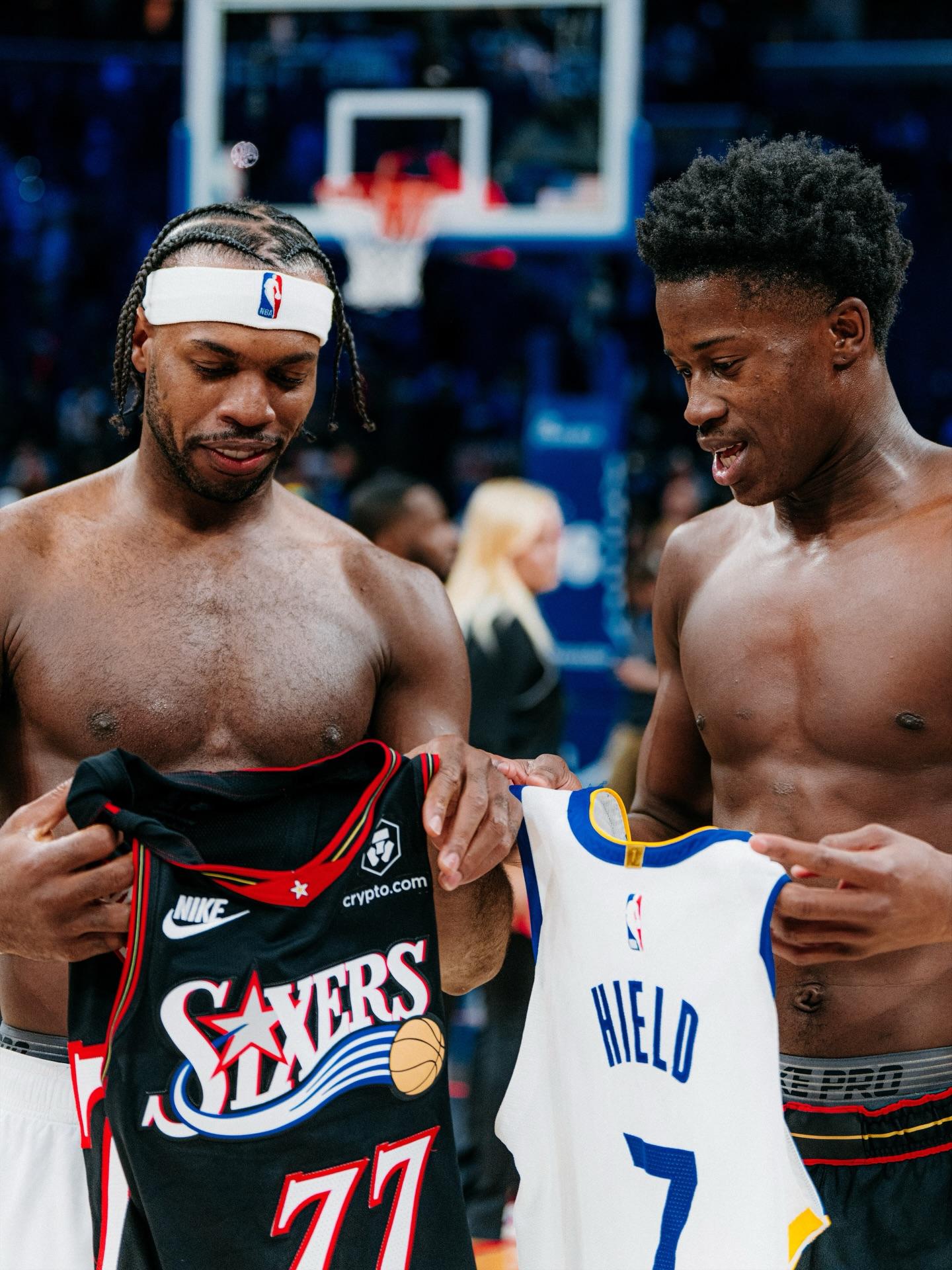 虎扑12月05日讯今日NBA常规赛,76人凭借VJ-埃奇库姆的补篮绝杀险胜勇士。赛后76人官方更新ins,晒出两位巴哈马籍球员VJ-埃奇库姆和巴迪-希尔德交换球衣的照片,并配文:“巴哈马纽带。”