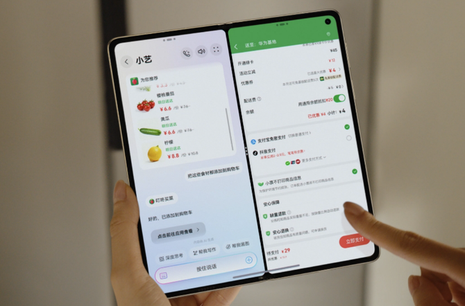 若说硬件是华为MateX7的骨架,在鸿蒙操作系统6加持下的小艺A2A智能体便是灵魂,颠覆传统语音助手体验。A2A智能体实现跨应用协同,“一句话完成复杂任务”:说“东方财富提供股票信息”,即呈现股市热点与趋势;出差时说“深圳航空选看日落座位”,自动值机到心仪的座位;减脂时对着小艺说“叮咚买菜,我想做低卡餐”,一键下单食材坐等送到家。