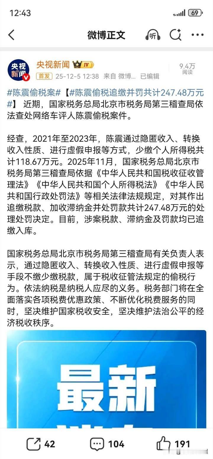 近日有网友发现顶流车评人陈震被全网禁言,正当大家不知道什么原因的时候,官媒消息来了,原来是偷税漏税! 陈震偷税追缴并罚共计247.48万元 近期,国家税务总局北京市税务局第三稽查局依法查处网络车评人陈震偷税案件。 经查,2021年至2023年,陈震通过隐匿收入、转换收入性质、进行虚假申报等方式,少缴个人所得税共计118.67万元。