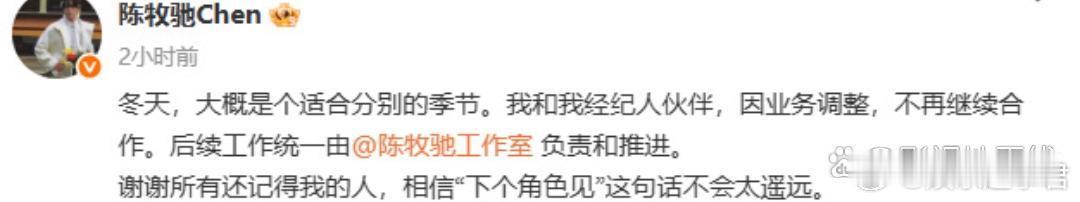 12月5日,陈牧驰发文称与经纪人伙伴不再继续合作。全文如下:冬天,大概是个适合分别的季节。我和我经纪人伙伴,因业务调整,不再继续合作。后续工作统一由陈牧驰工作室负责和推进。谢谢所有还记得我的人,相信“下个角色见”这句话不会太遥远。