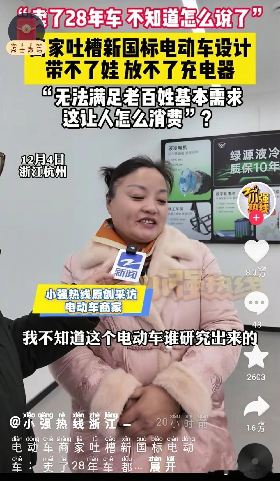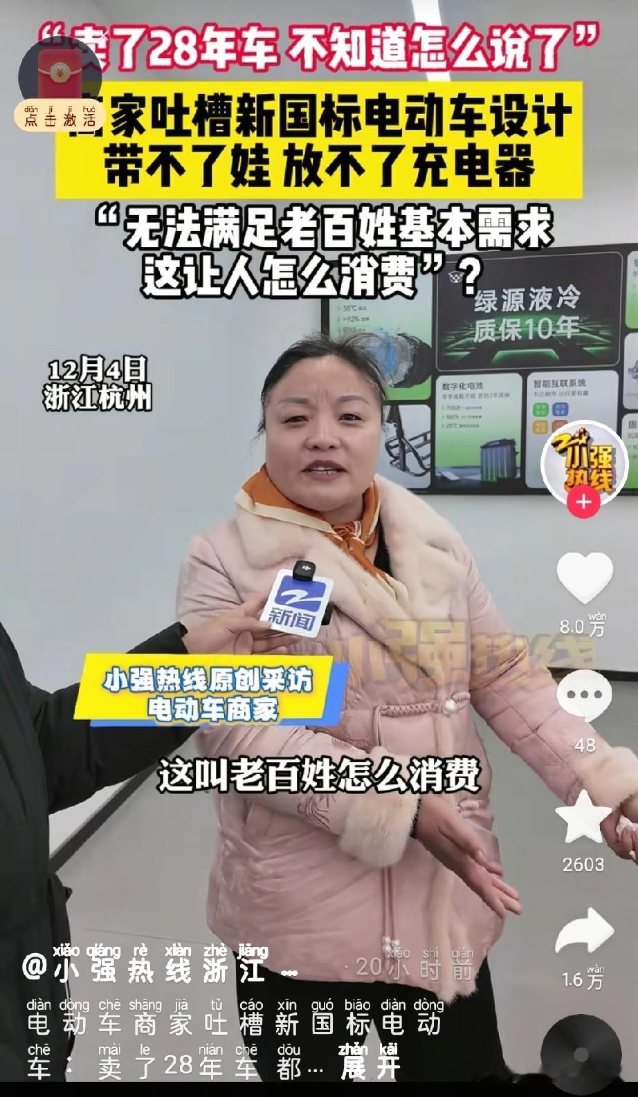 卖了28年电动车的商家都忍不住吐槽!新国标电动车设计能有多离谱? 12月4日浙江杭州,一位卖了28年电动车的商家接受采访时大吐苦水。新国标电动车防阻燃、限速这些能理解,可连个篮子都装不了,带不了小孩,充电器、雨披没地方放,老百姓接送娃、放东西的基本需求全满足不了。 商家直言,要是自己买车,宁愿花钱买自行车也不买这电动车。现在顾客来店里,她都不知道咋介绍车子了。 新国标本是为规范市场,可这般脱离实际的设计,让商家难卖、百姓难用,实在是本末倒置。