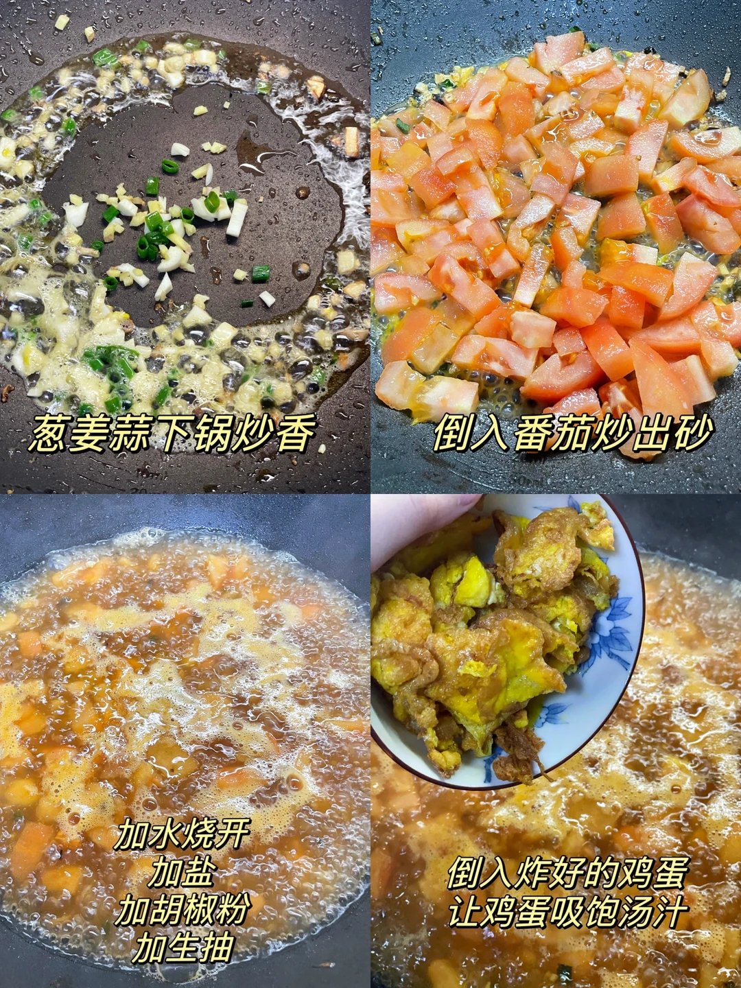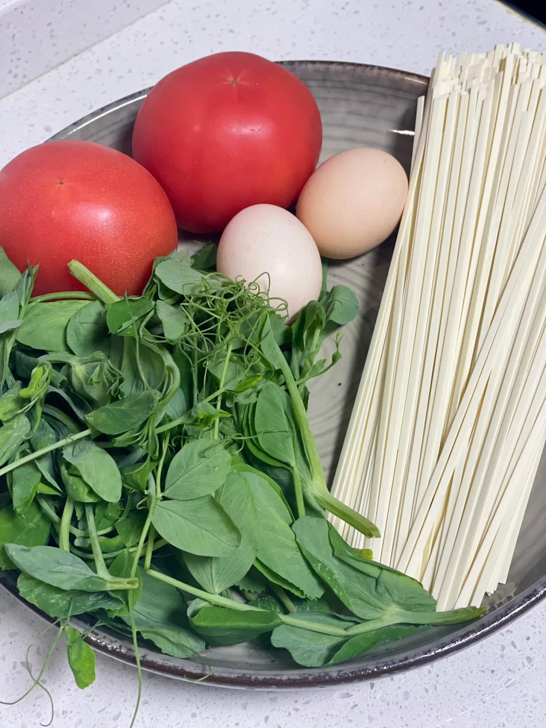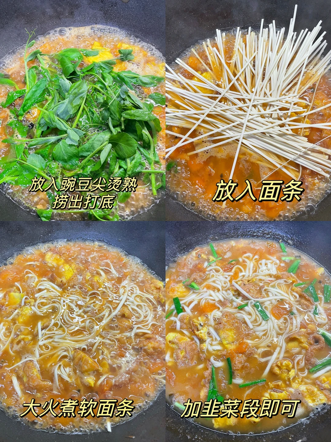 超鲜超浓郁的番茄鸡蛋面,鸡蛋吸饱了汤汁,加上最爱的豌豆尖,鲜度增加了不止一点点🍜 食材:番茄 鸡蛋 豌豆尖 面 猪油 韭菜 葱花 蒜末 姜末 1⃣️:番茄烫皮切丁备用,鸡蛋打散倒入锅中炸至金黄气泡搅碎盛出 2⃣️:锅中加猪油和菜油炒化倒入番茄翻炒出砂,加水烧开,加一勺盐,一勺白胡椒粉,一勺生抽调味,倒入鸡蛋煮至吸饱汤汁,放入豌豆尖烫熟捞出打底,再放入面条煮软,最后加韭菜段即可