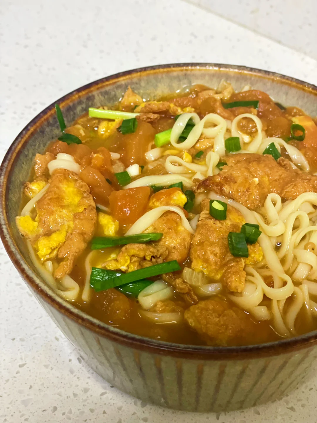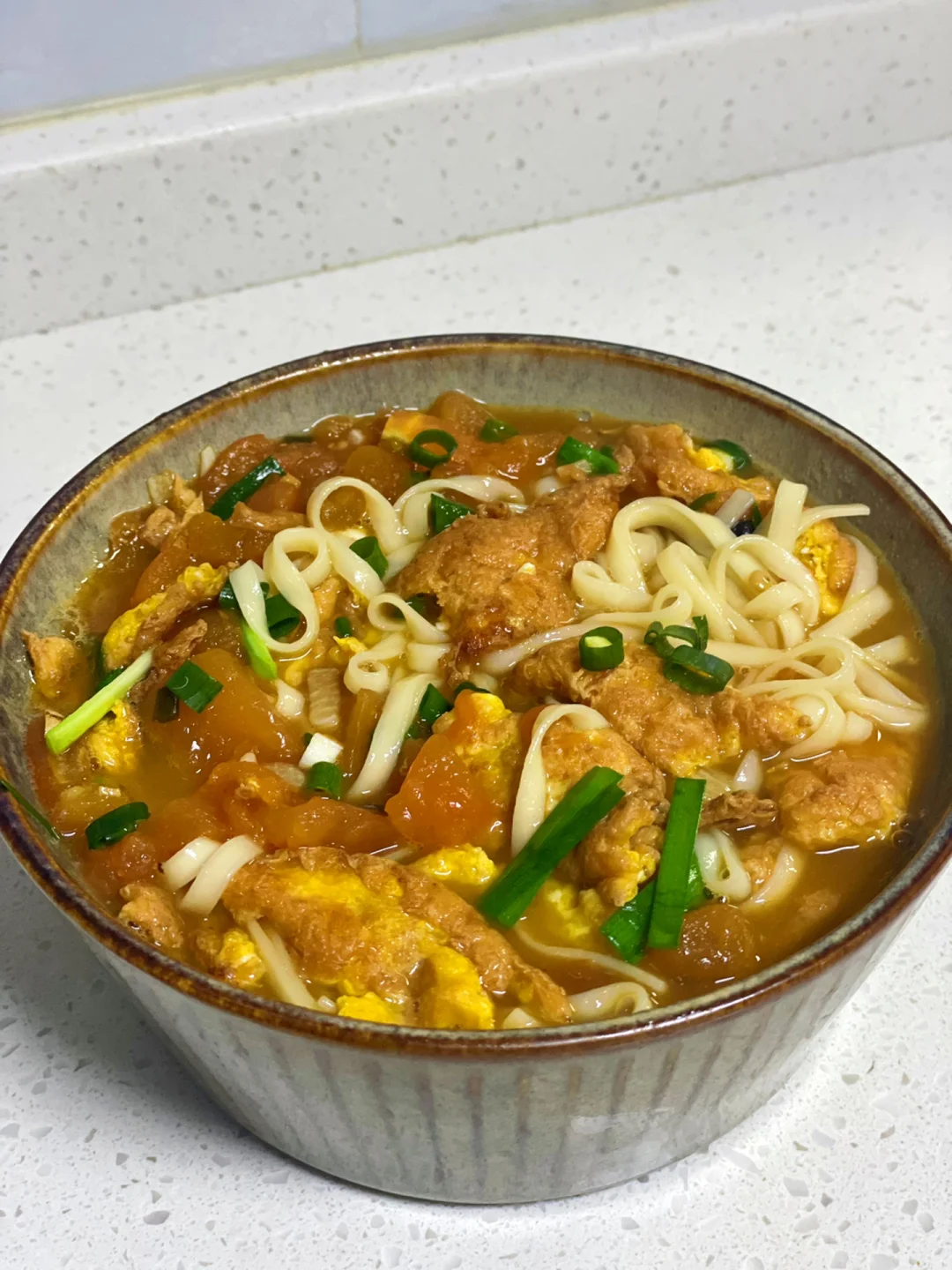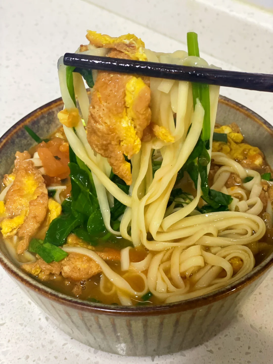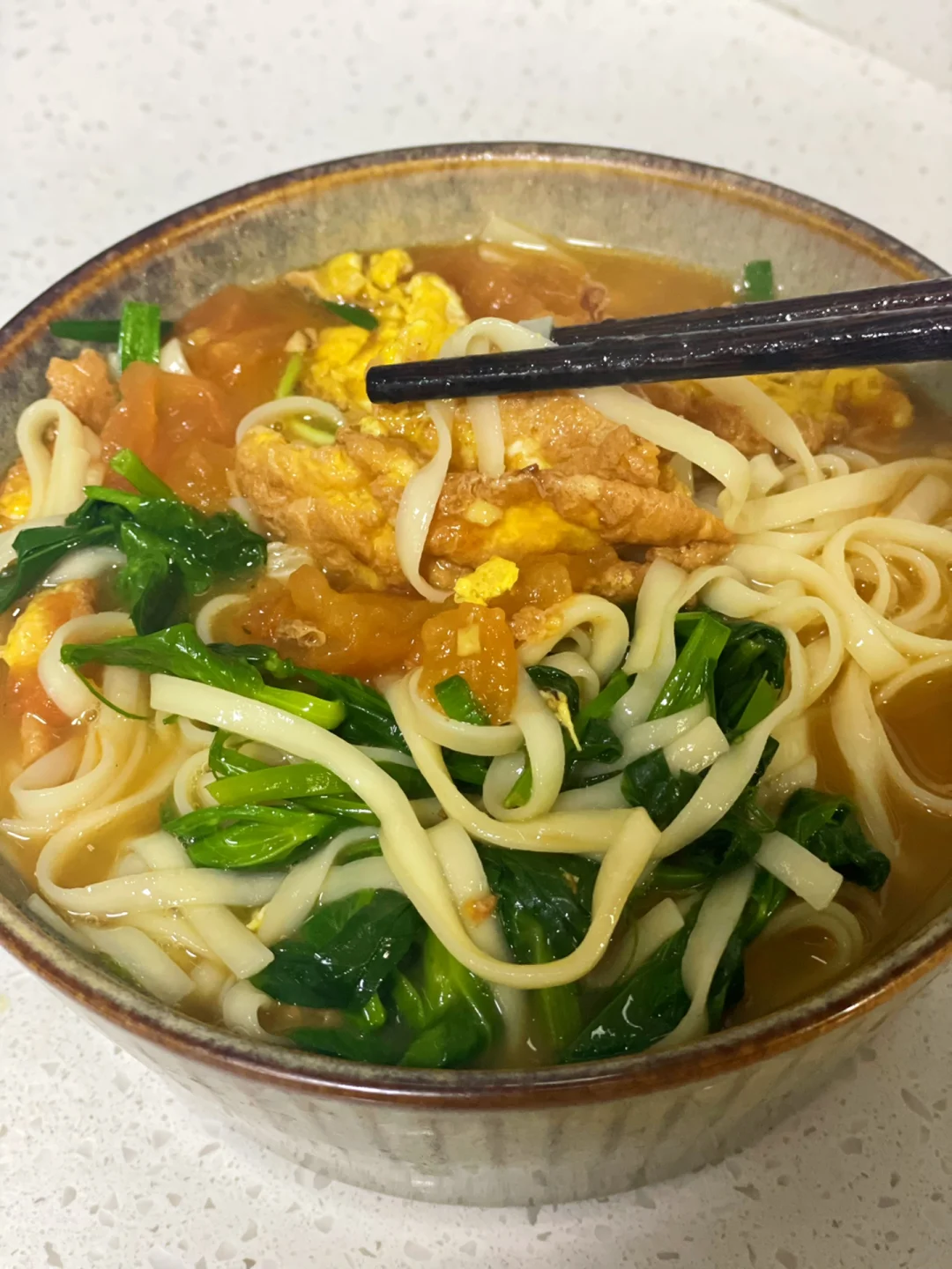 超鲜超浓郁的番茄鸡蛋面,鸡蛋吸饱了汤汁,加上最爱的豌豆尖,鲜度增加了不止一点点🍜 食材:番茄 鸡蛋 豌豆尖 面 猪油 韭菜 葱花 蒜末 姜末 1⃣️:番茄烫皮切丁备用,鸡蛋打散倒入锅中炸至金黄气泡搅碎盛出 2⃣️:锅中加猪油和菜油炒化倒入番茄翻炒出砂,加水烧开,加一勺盐,一勺白胡椒粉,一勺生抽调味,倒入鸡蛋煮至吸饱汤汁,放入豌豆尖烫熟捞出打底,再放入面条煮软,最后加韭菜段即可