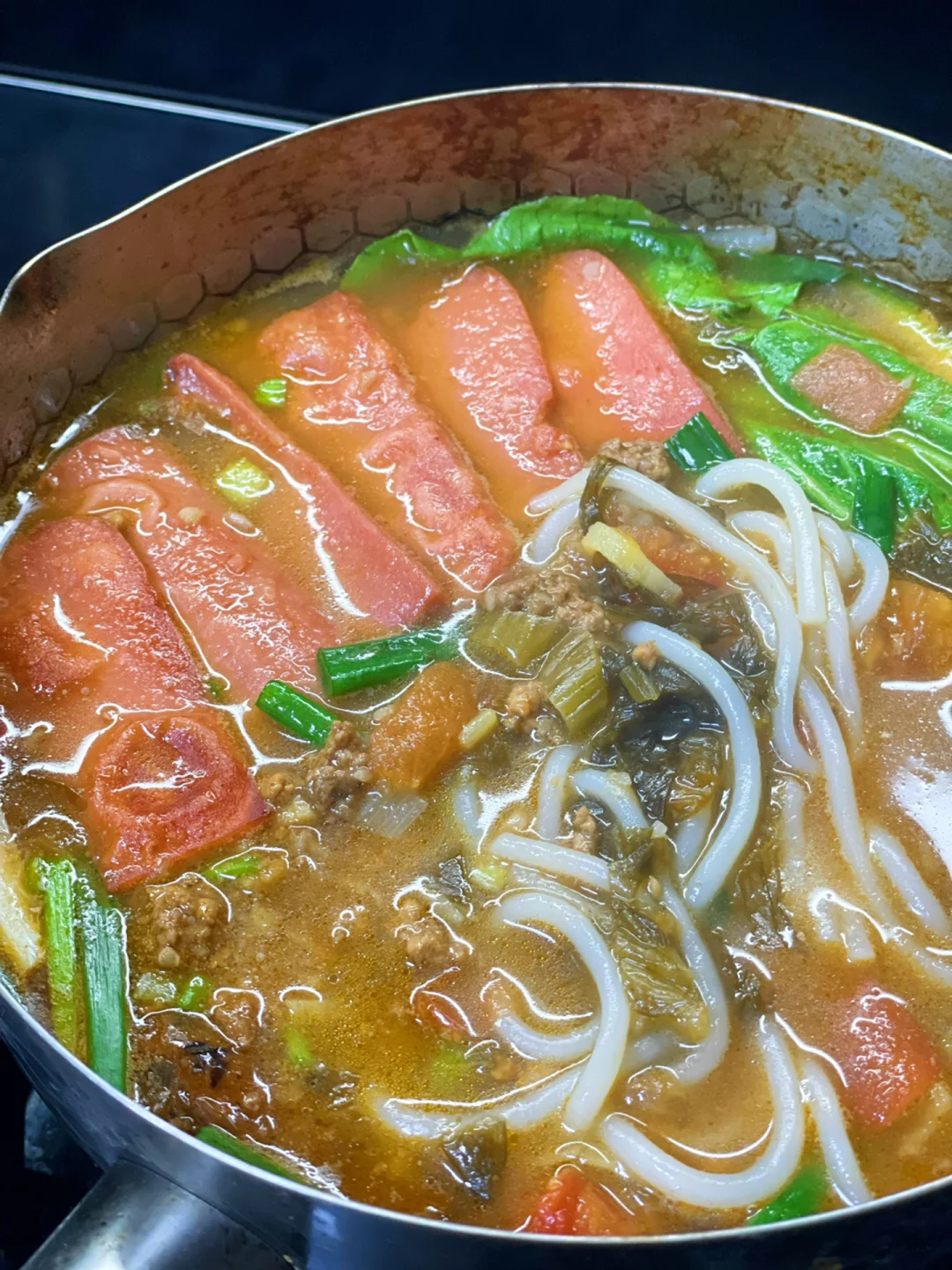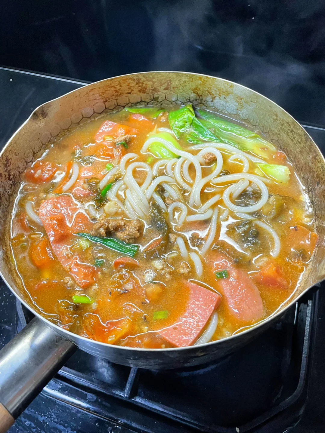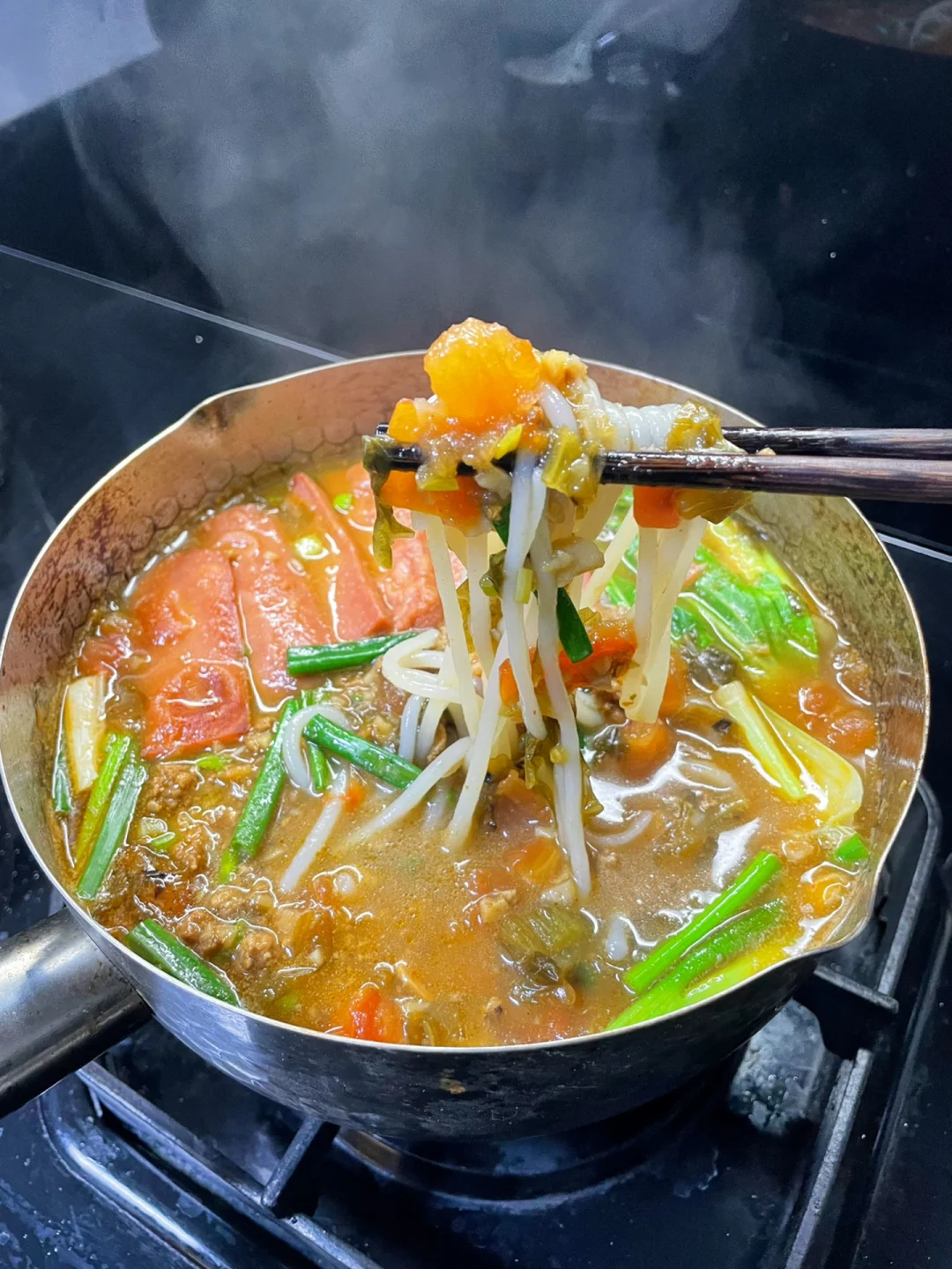 有番茄有酸菜还有包包子剩下的肉馅,这样的神仙搭配也太诱惑了,汤汁超级浓郁,既开胃又解腻,一锅吃完还意犹未尽☺️