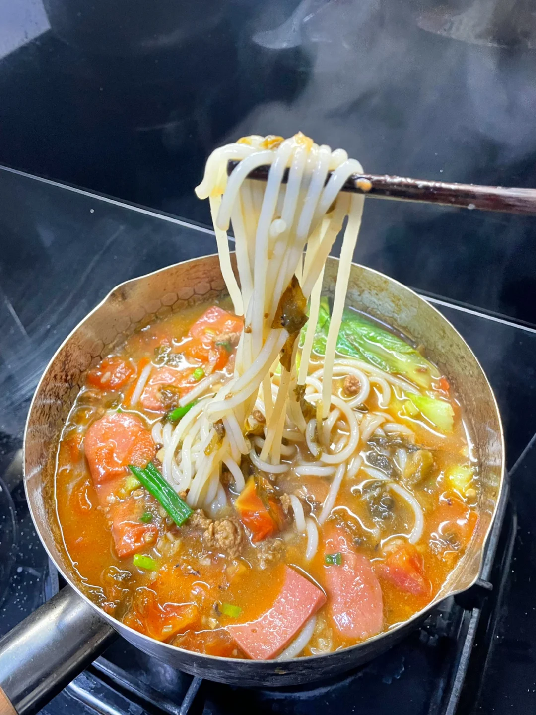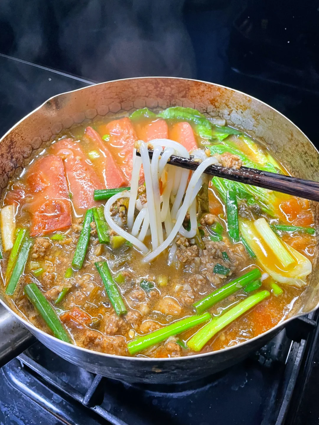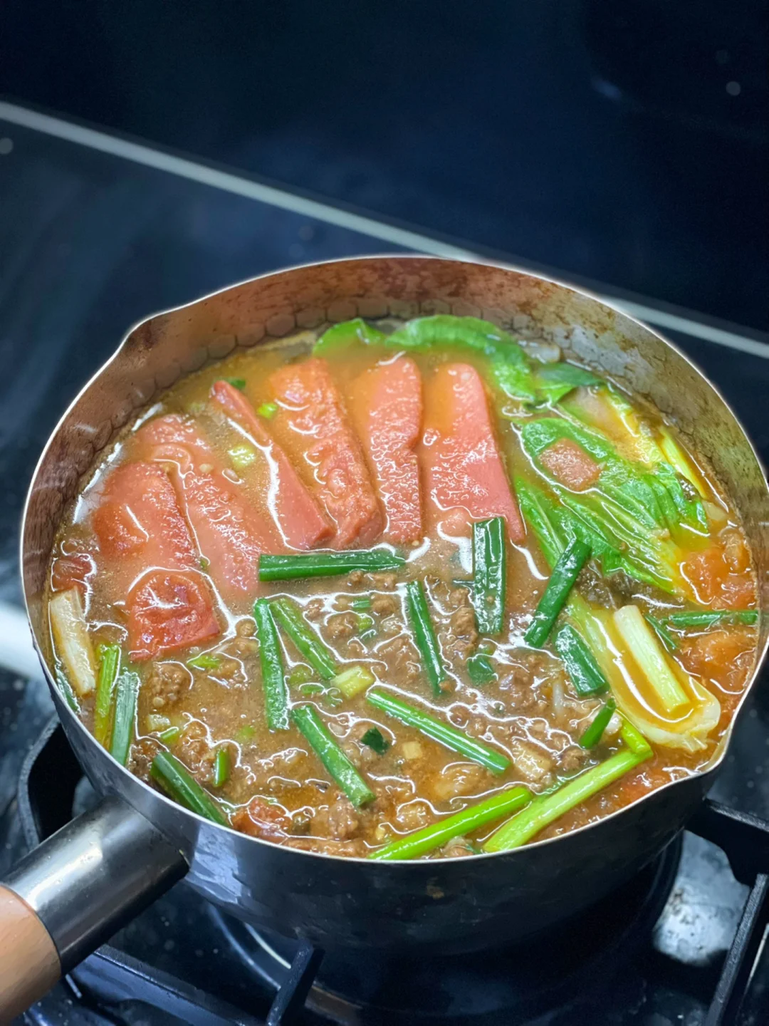 有番茄有酸菜还有包包子剩下的肉馅,这样的神仙搭配也太诱惑了,汤汁超级浓郁,既开胃又解腻,一锅吃完还意犹未尽☺️