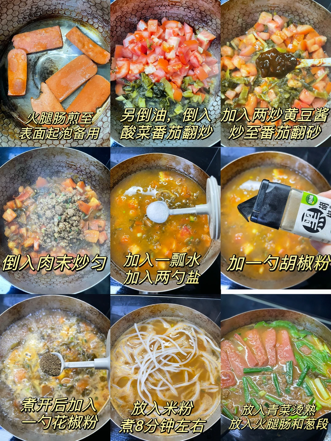 1⃣️:番茄切丁,酸菜切碎,火腿肠切片,葱切段,姜切粗丝,肉末的做法在上一篇笔记里